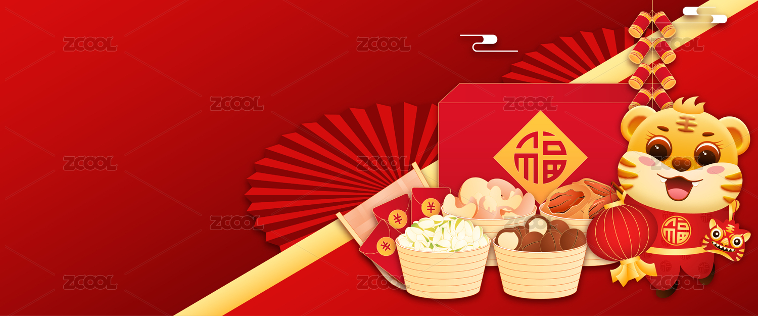 两只老虎提着灯笼和布老虎在福字前奔跑