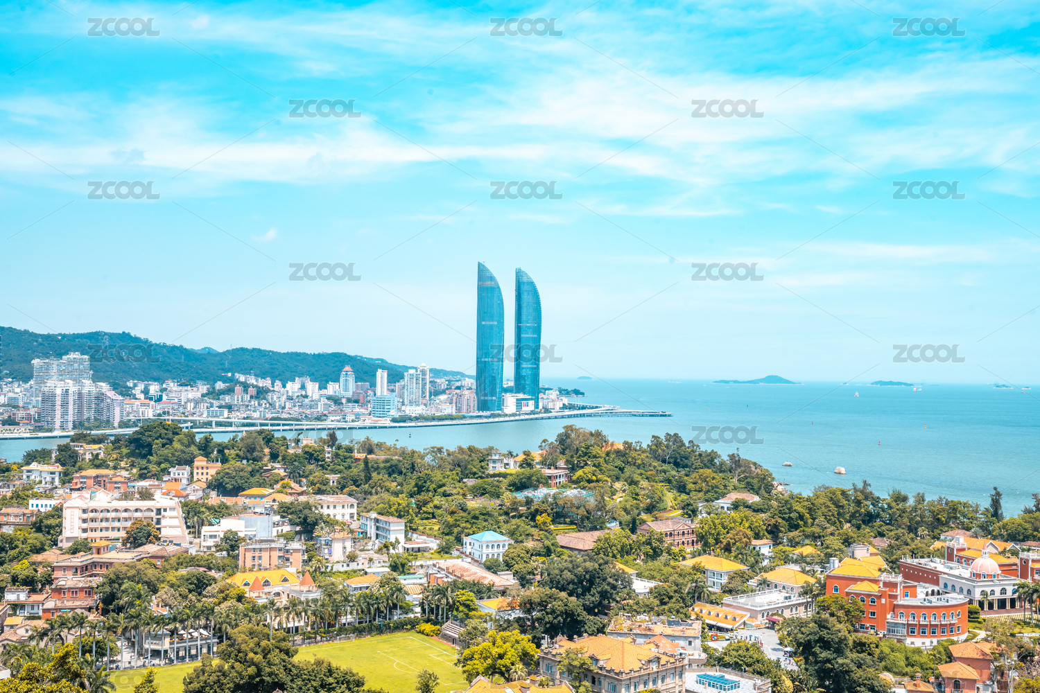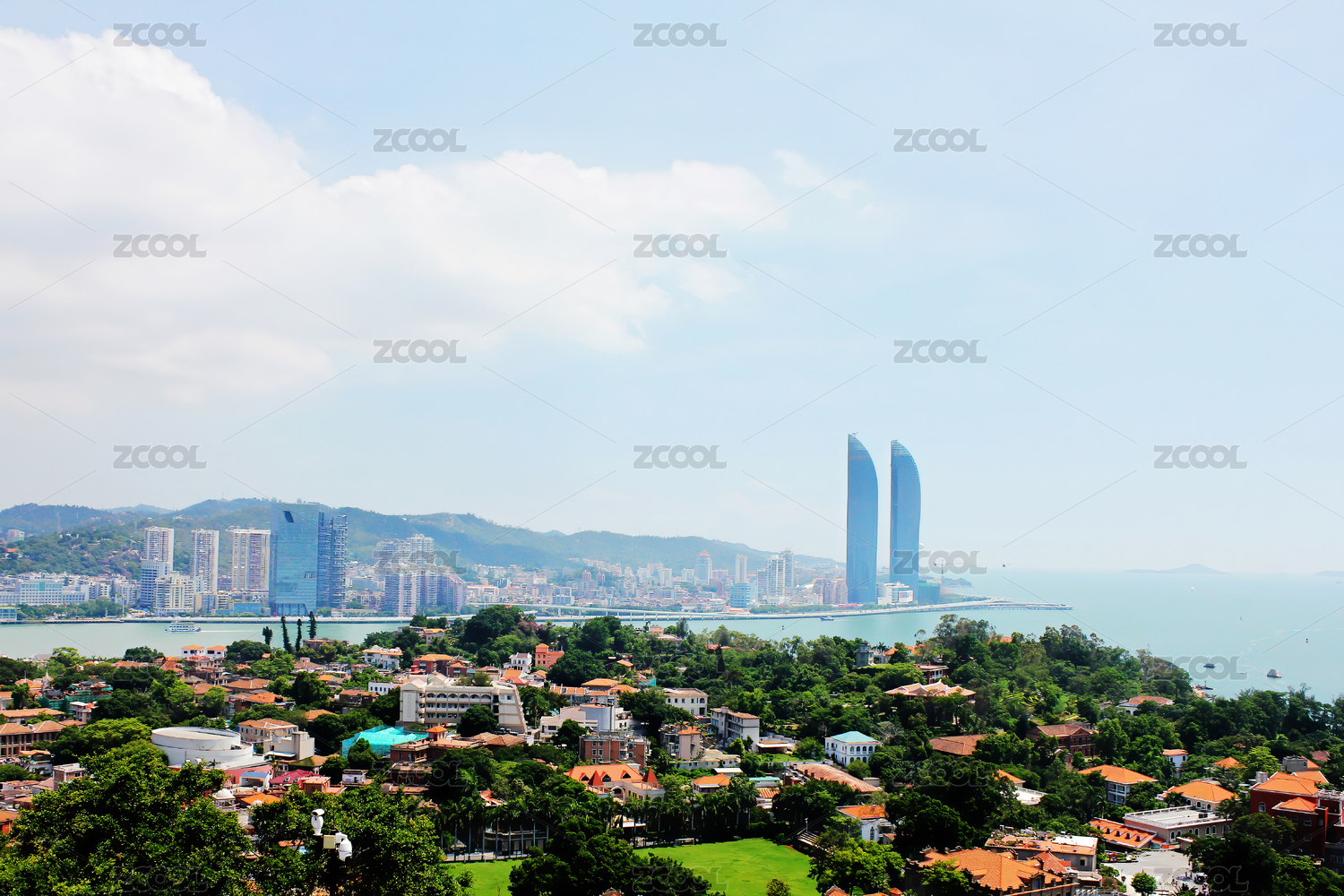 福建省厦门市鼓浪屿日光岩俯瞰双子塔海岸线