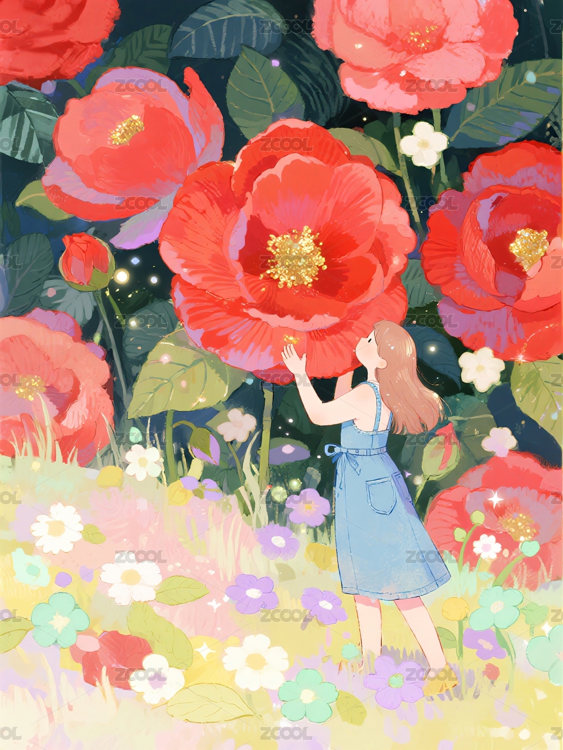 格桑花丛上有两个精灵女孩在花朵上飞舞
