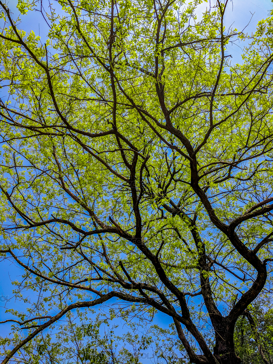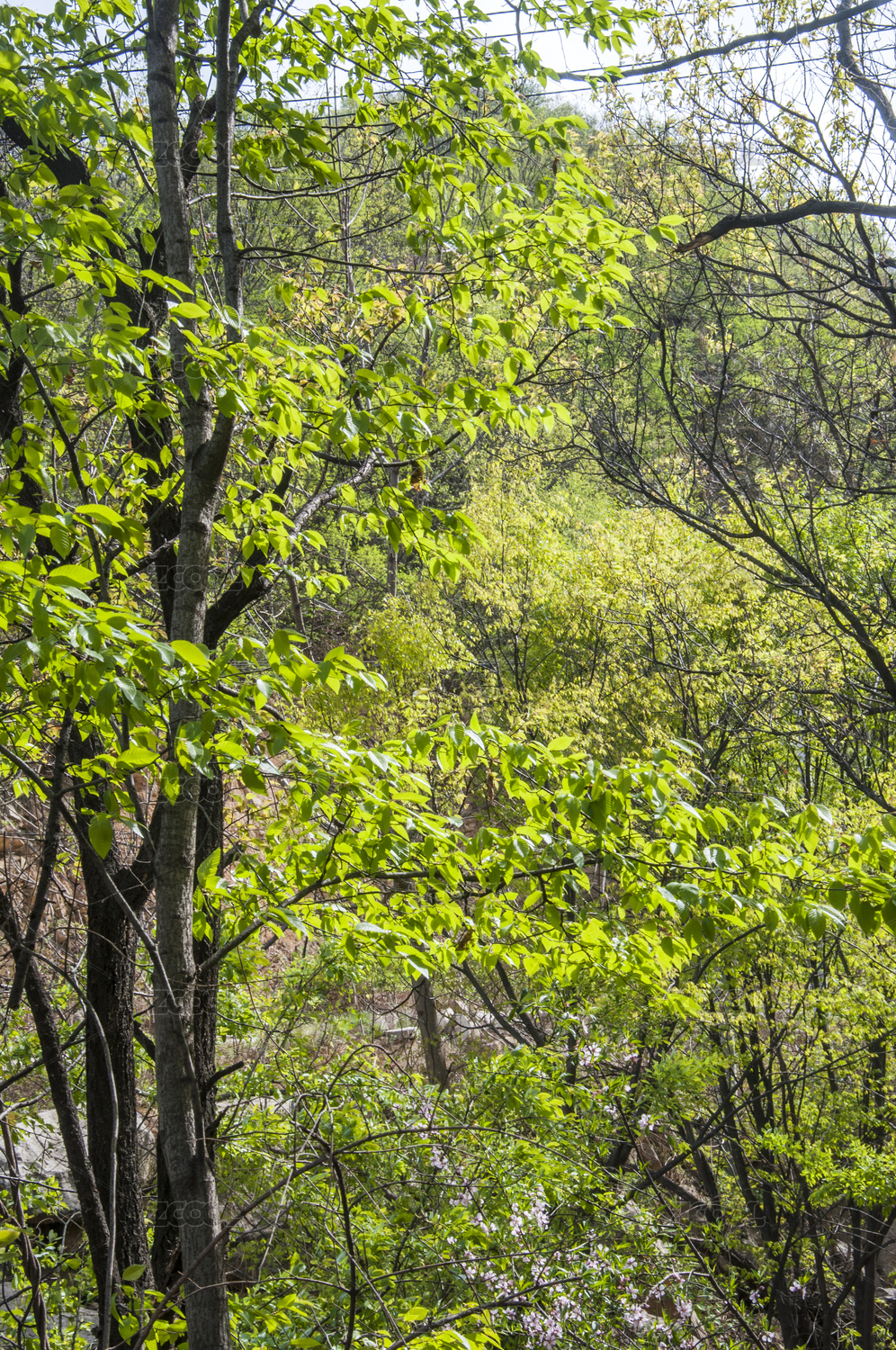 春季,逆光,山林,阳光照射,嫩绿,嫩叶,生机,绿色,茂盛,黑色枝干