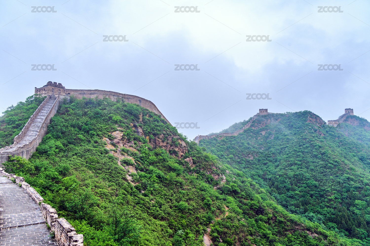中国夏季金山岭长城阴天下雨云雾风光