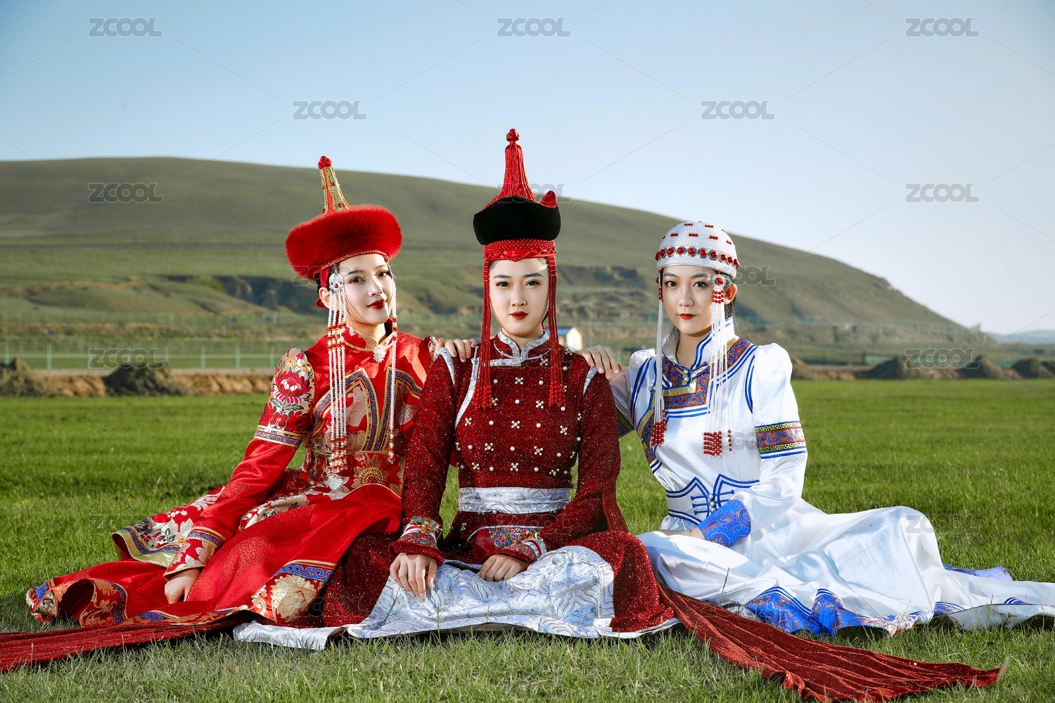 草原上穿着蒙古族传统服饰的亚洲年轻女性