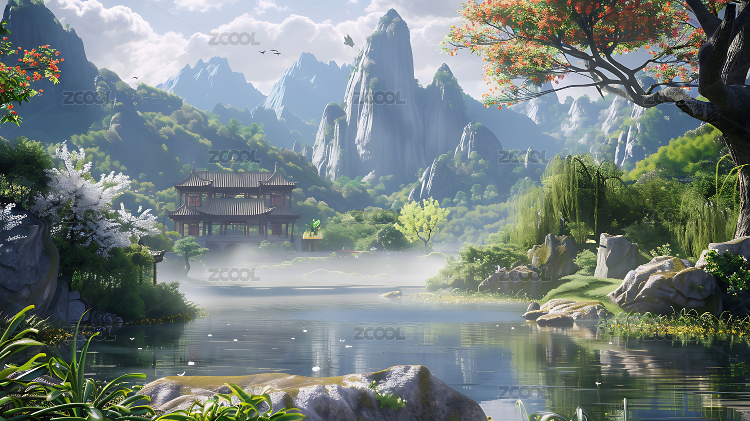 中式,山水,中国风,千里江山,仙境,云雾,古风,简约,风景,自然