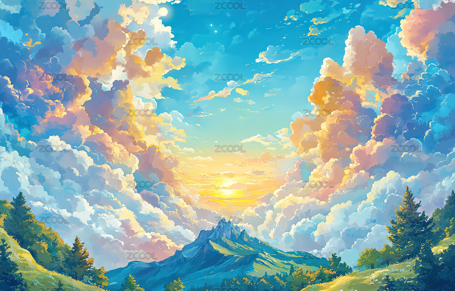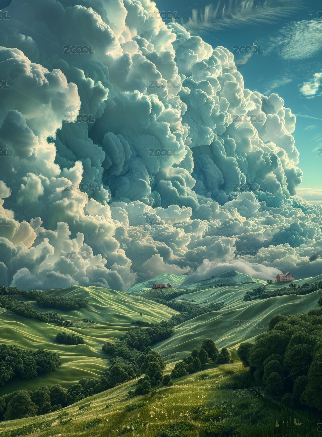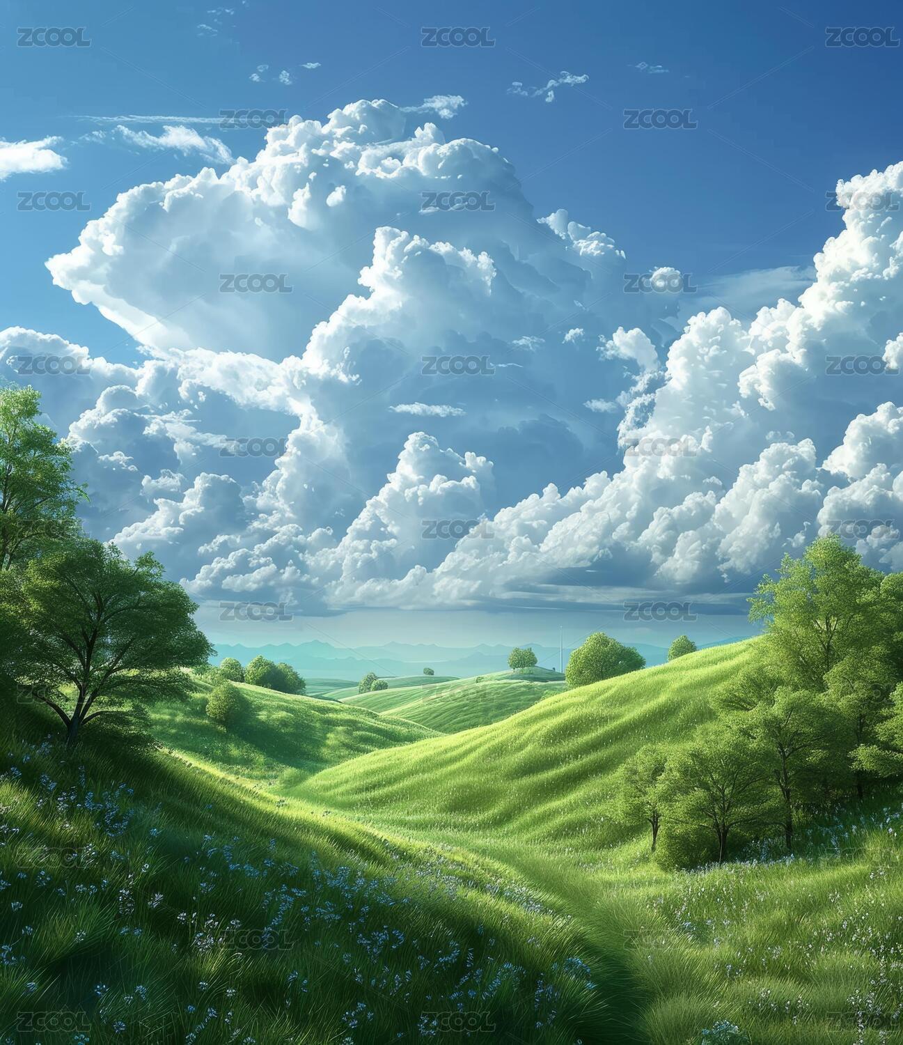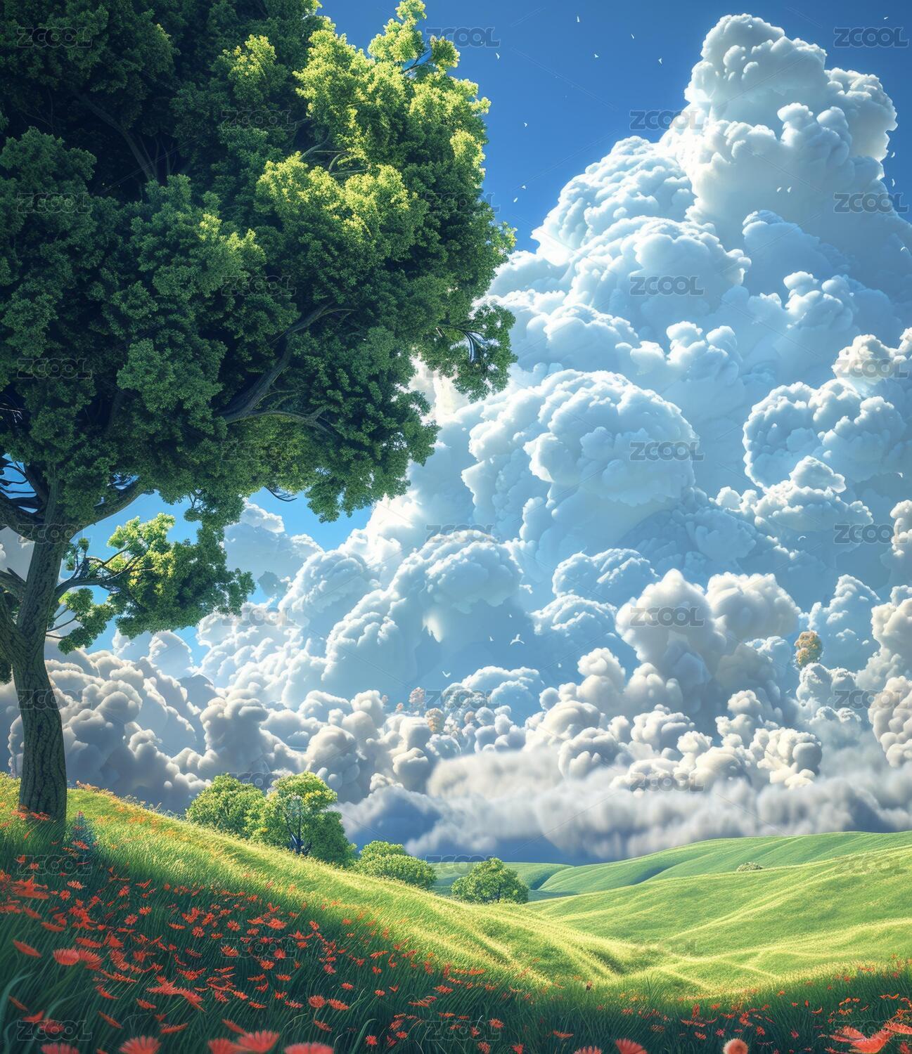 连绵起伏的绿色山丘和一棵大树背景是云朵