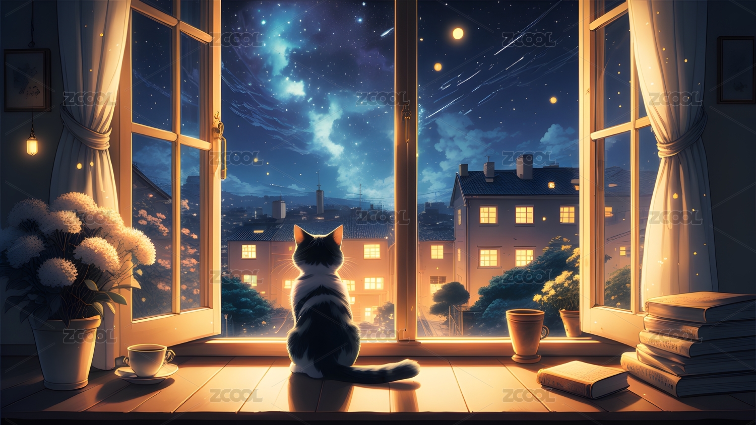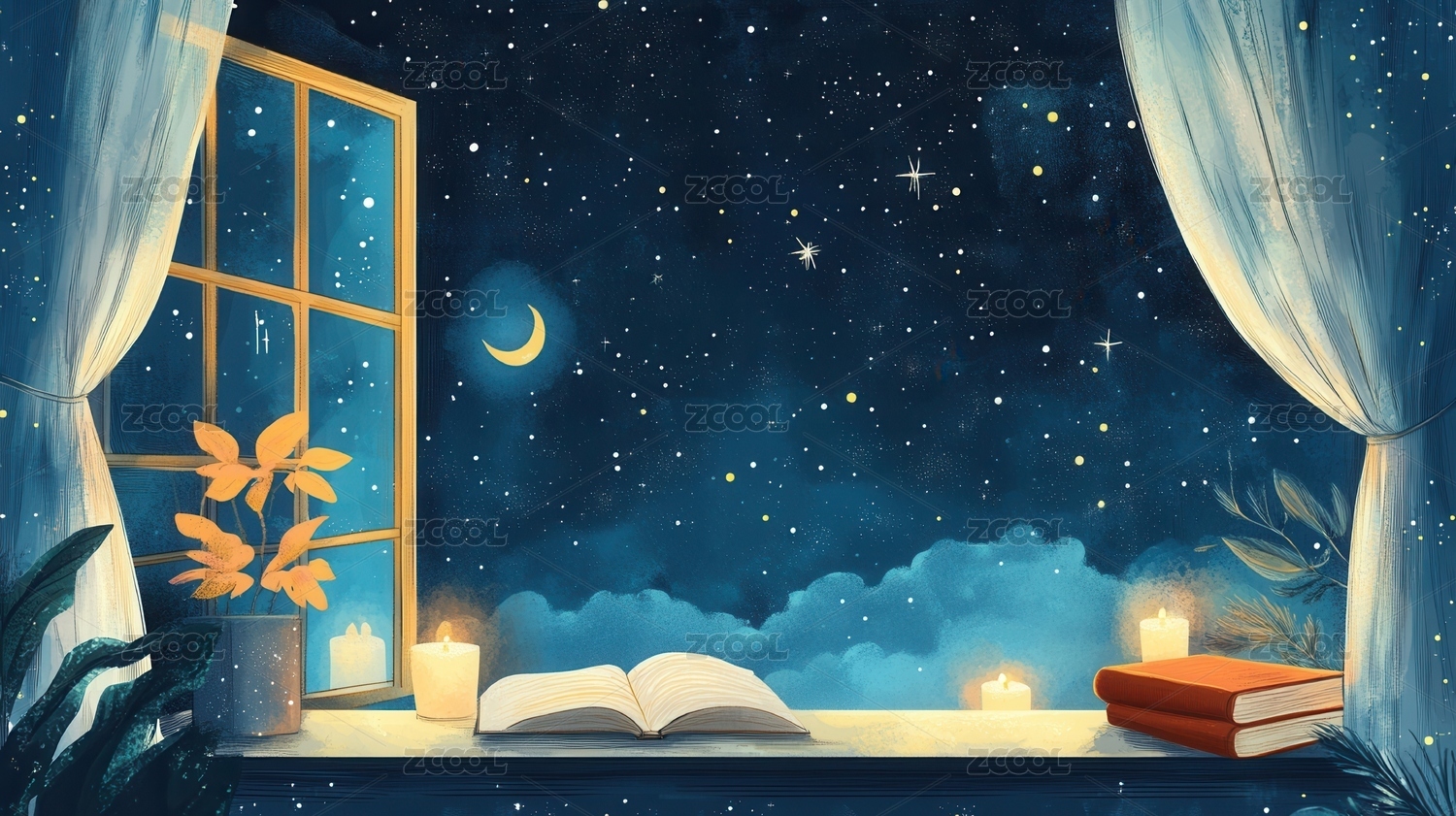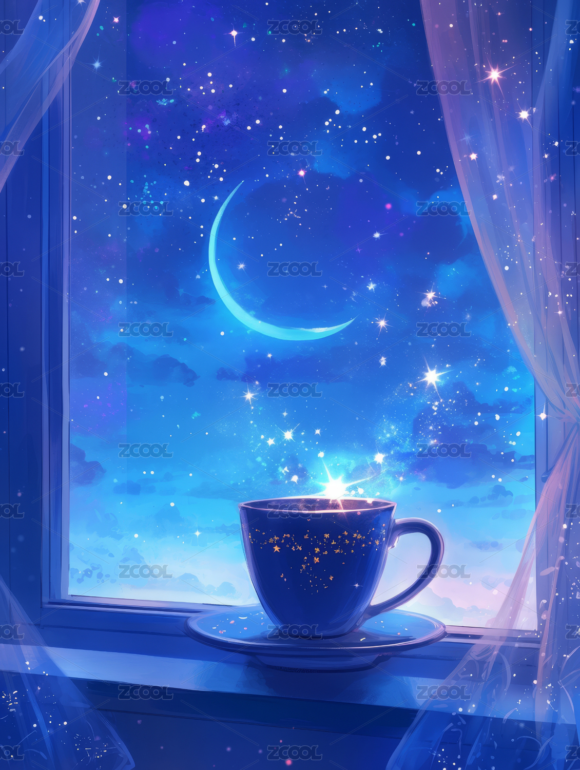 月亮,窗台,杯子,小清新,插画,浪漫,梦幻,唯美,中秋节