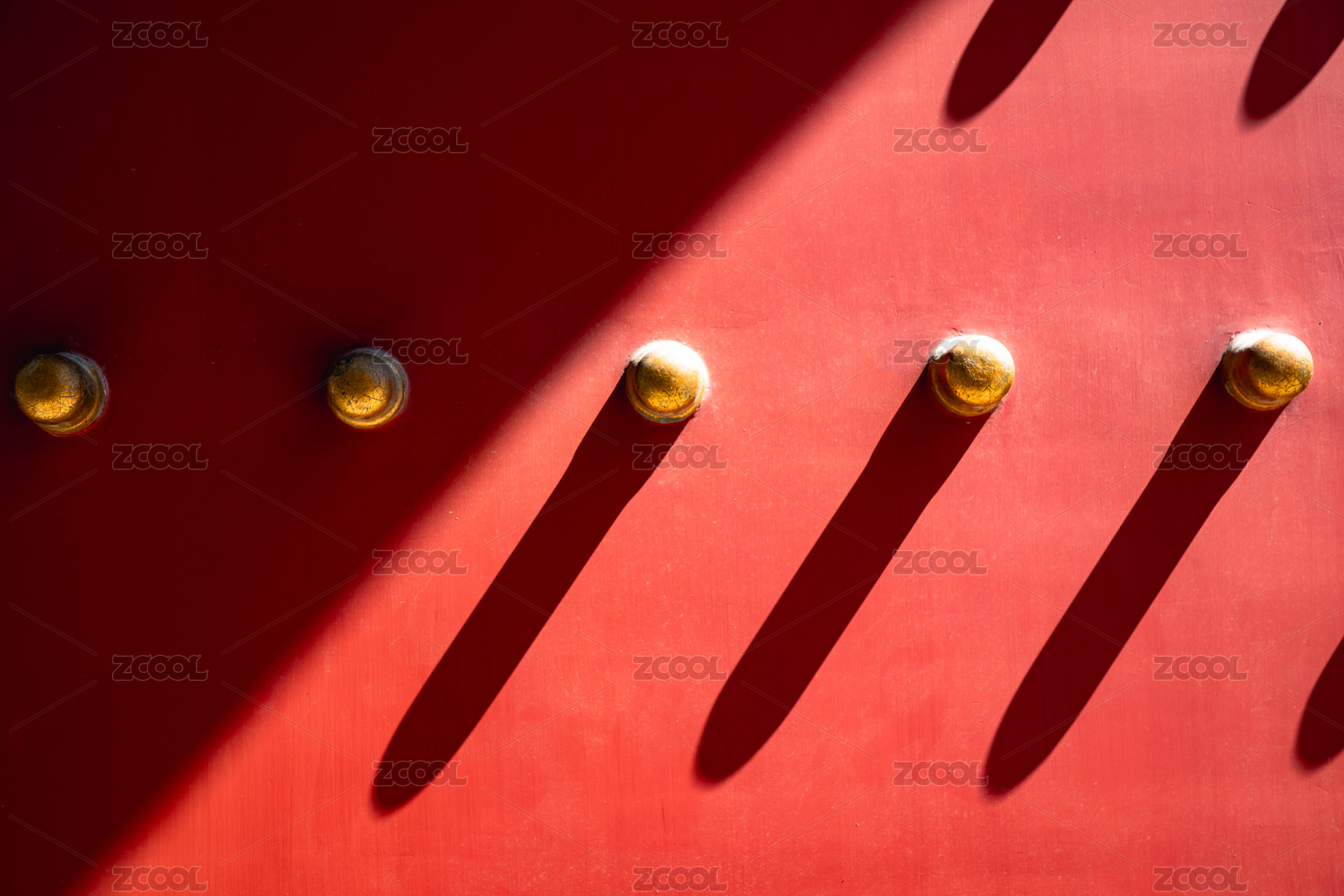 光影下的红色宫门上镶嵌着金黄色的门钉
