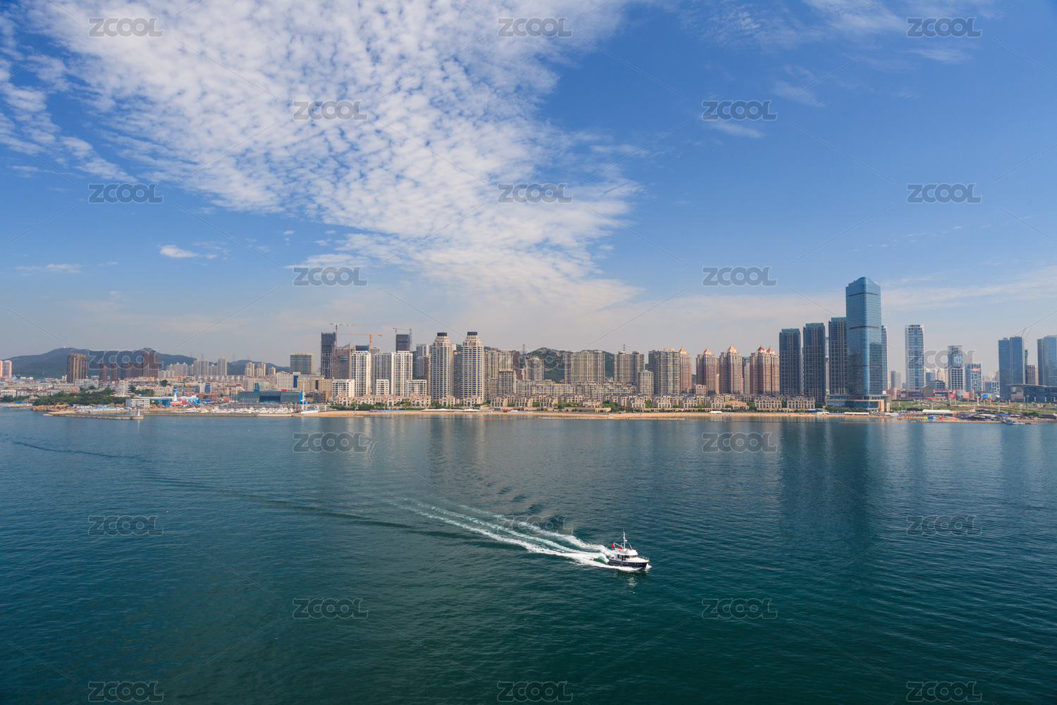 在游艇上眺望威海城市景观