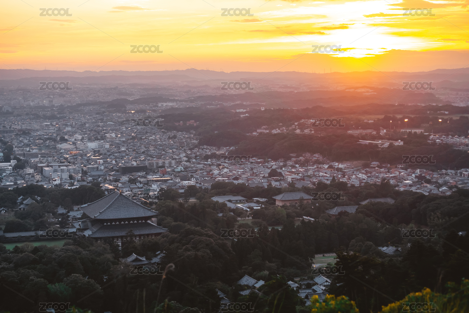 黄昏日落时,日本奈良若草山上俯瞰城市全景