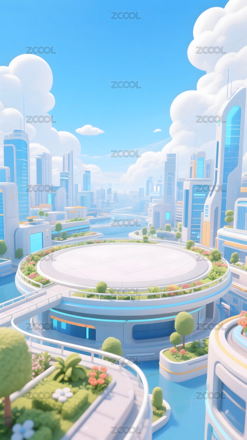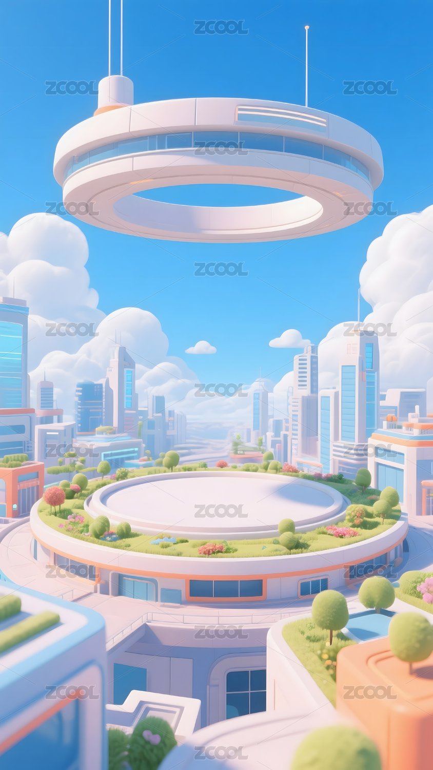 科幻夏天绿色悬浮城市屋顶模型3D卡通插画