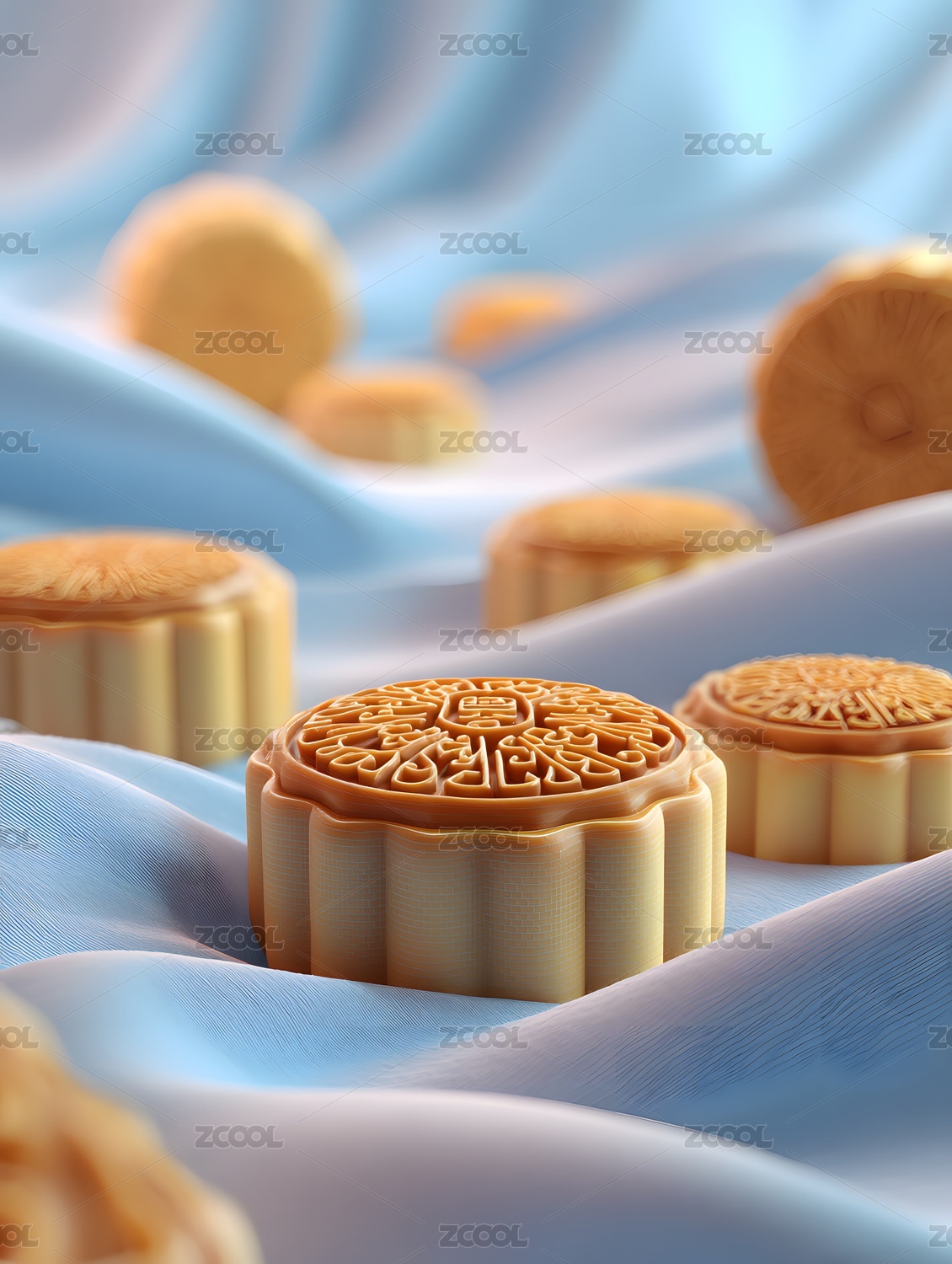 蓝色丝绸背景上的精致花纹月饼中秋美食