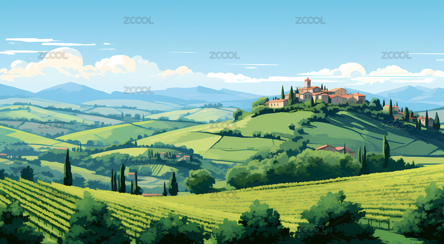 奇幻田野远方的山顶欧式古典尖顶城堡插画