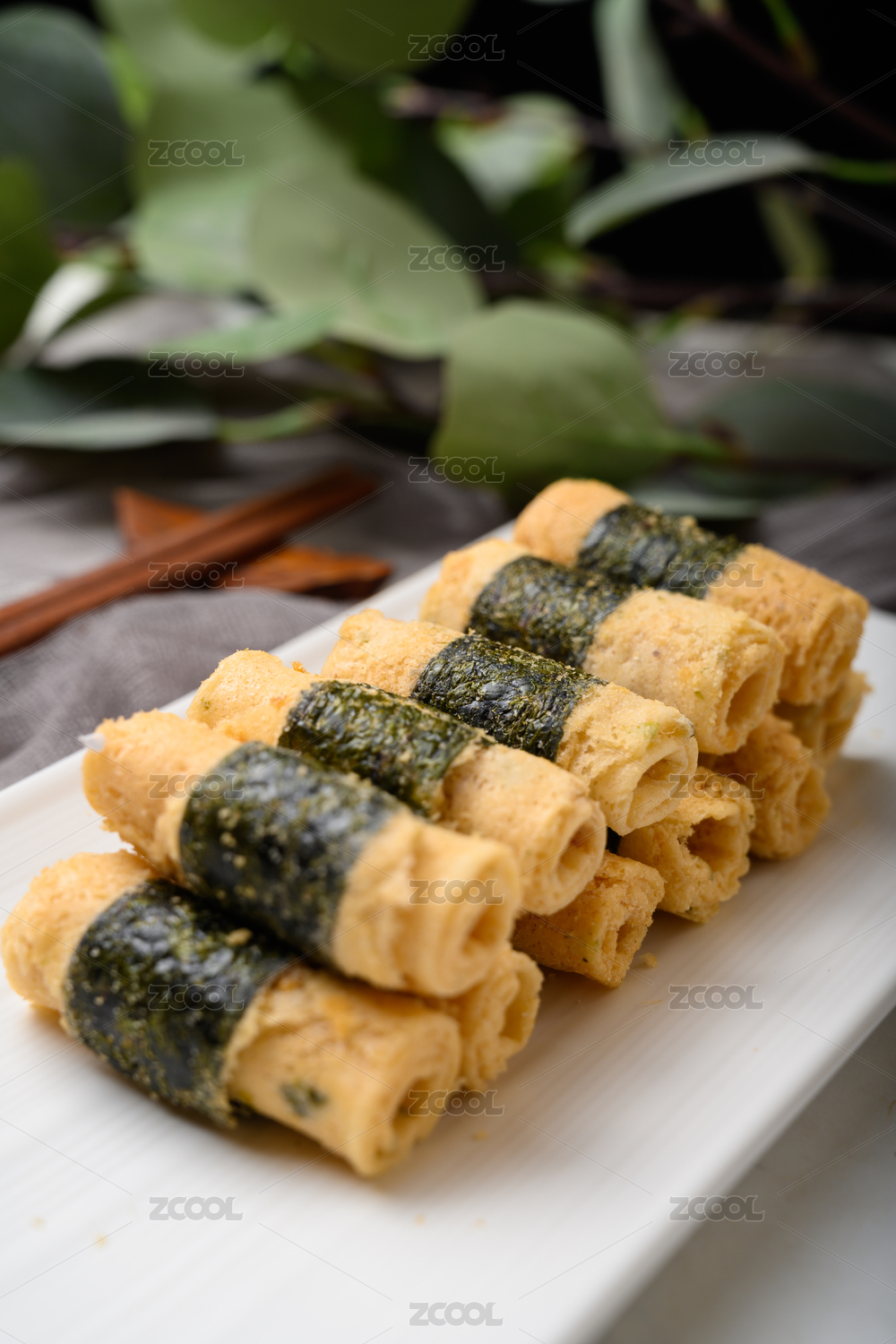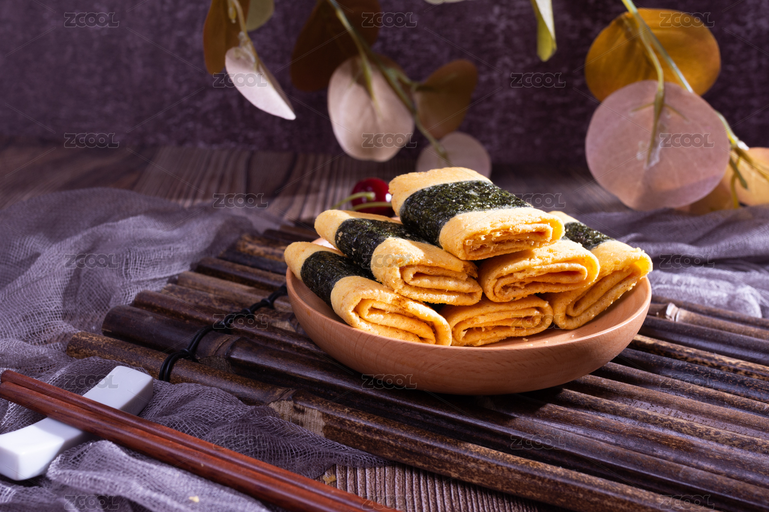 桌面上的白色陶瓷盘子里的紫菜蛋卷