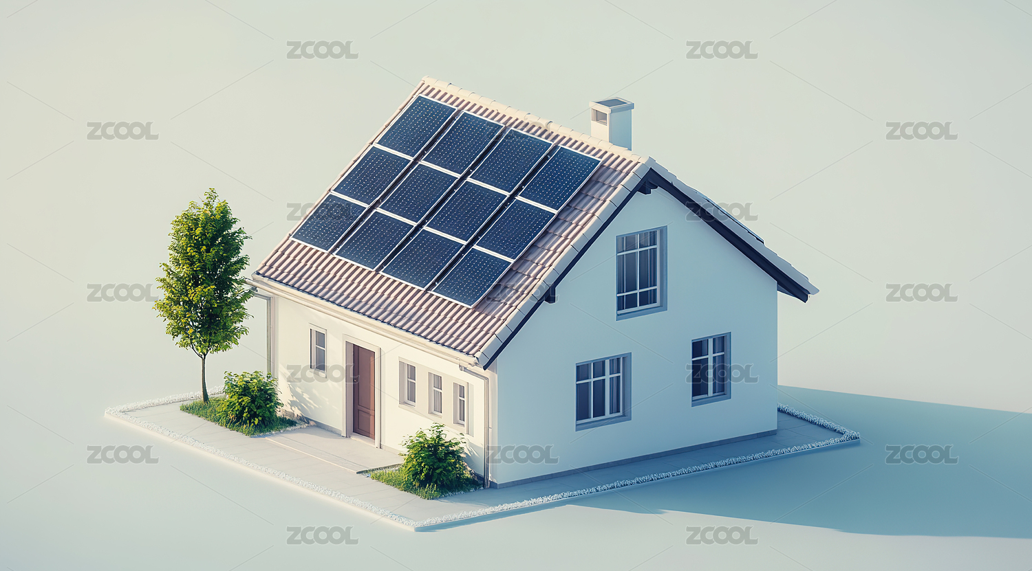 3D现代别墅与太阳能光伏板淡蓝色背景