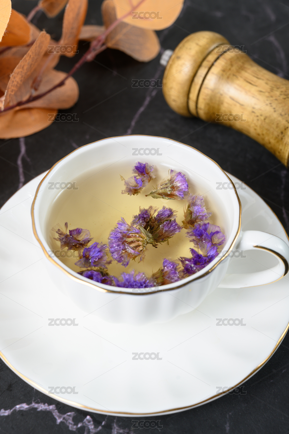 桌面上的杯子里的香甜可口的勿忘我花茶