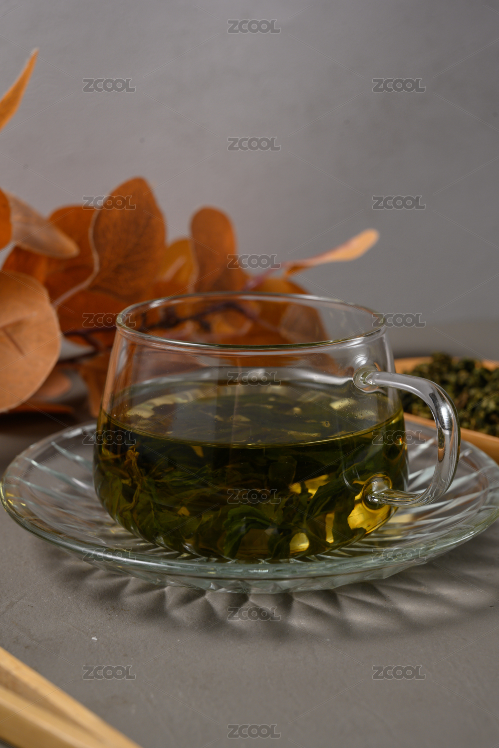 桌面上的杯子里的甘甜可口的茉莉吐珠茶