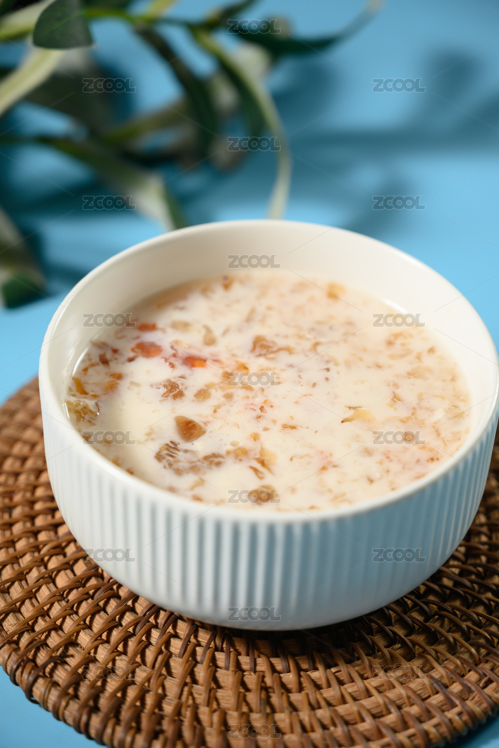桌面上的碗里的美味可口的牛奶炖桃胶