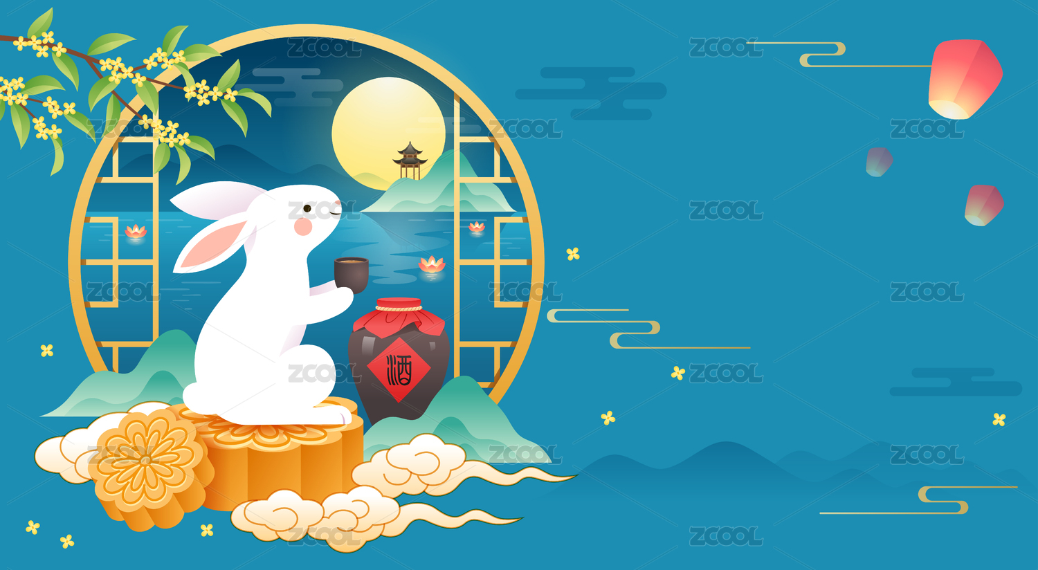 中秋节兔子赏月和月饼桂花酒坛等插画横版