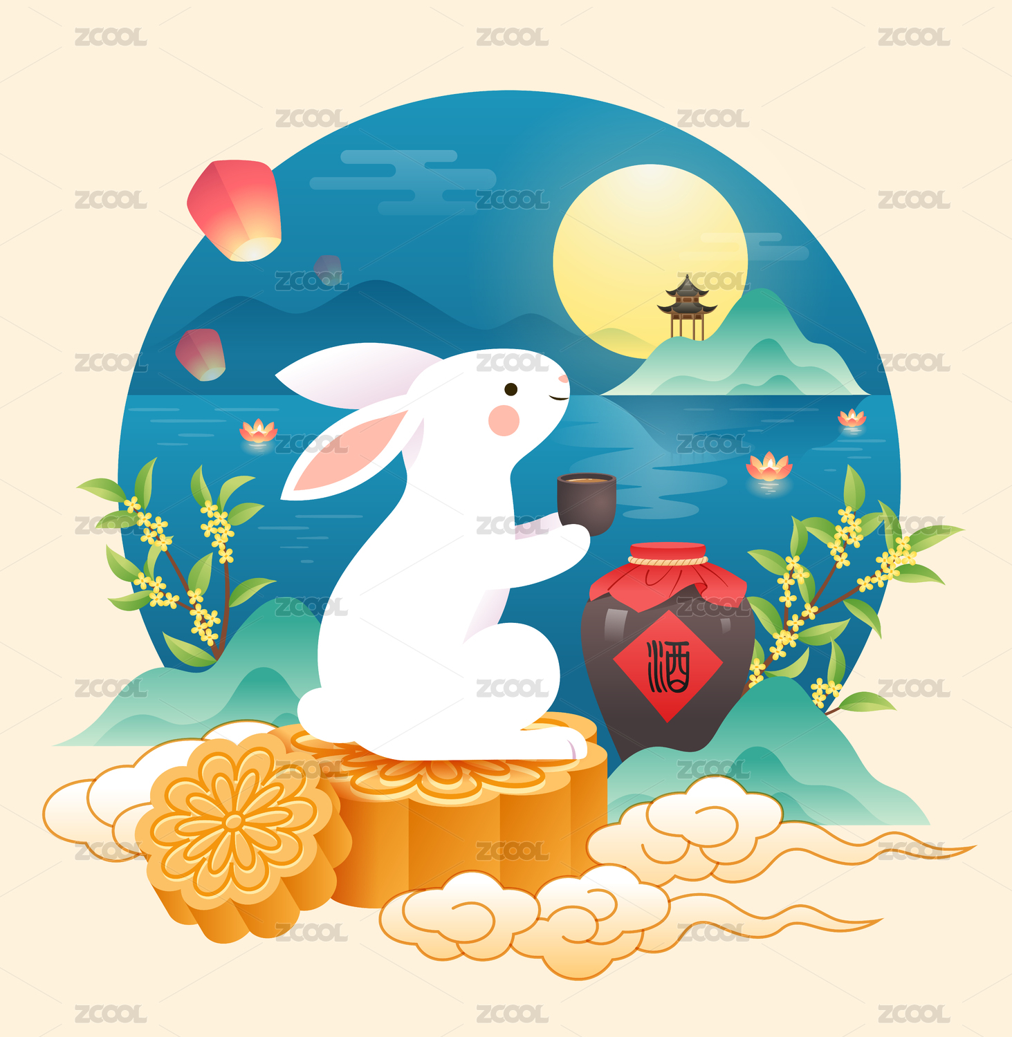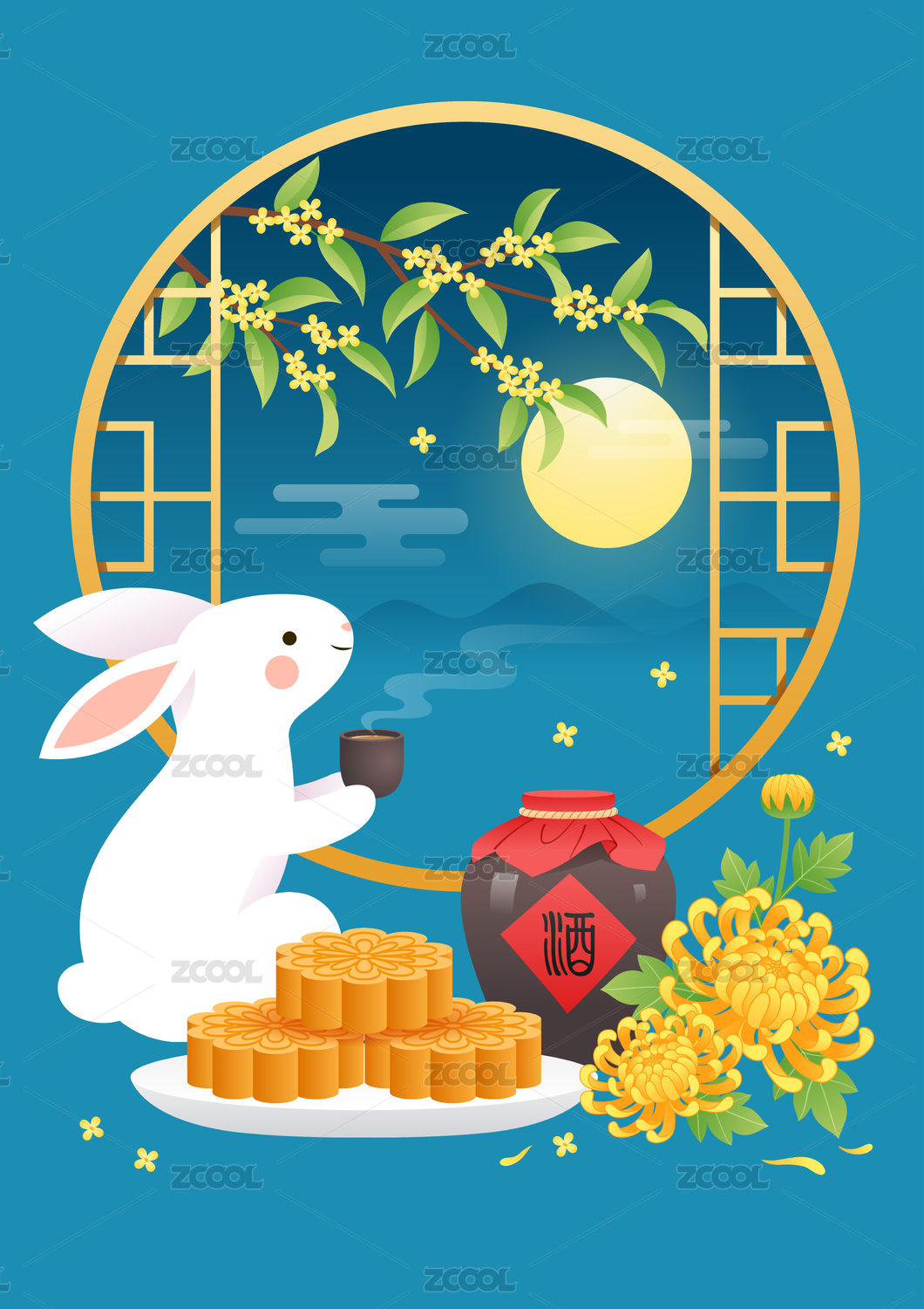 中秋节兔子月亮桂花酒坛月饼等插画海报