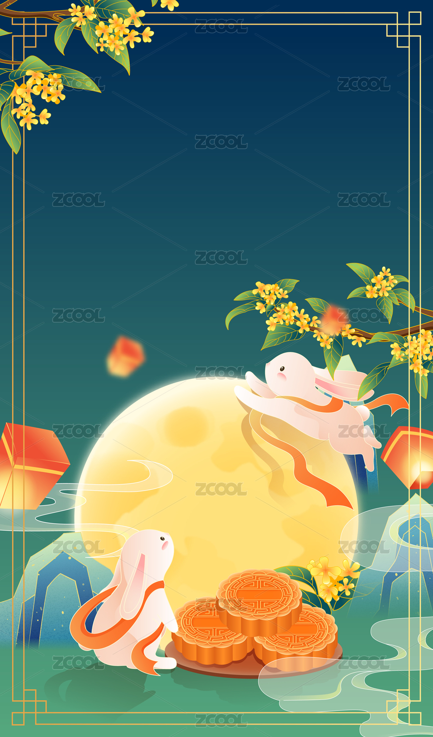 国潮中秋海报-中秋背景素材,月饼兔子灯笼