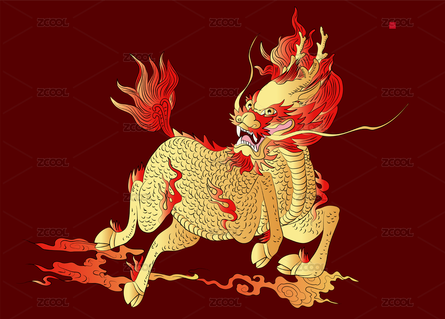 国潮手绘火麒麟神兽祥云矢量中国风年画