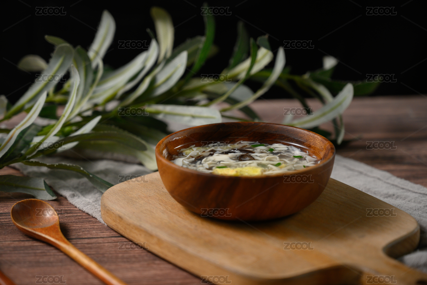 桌面上的碗里的美味可口的香菇鸡蛋汤