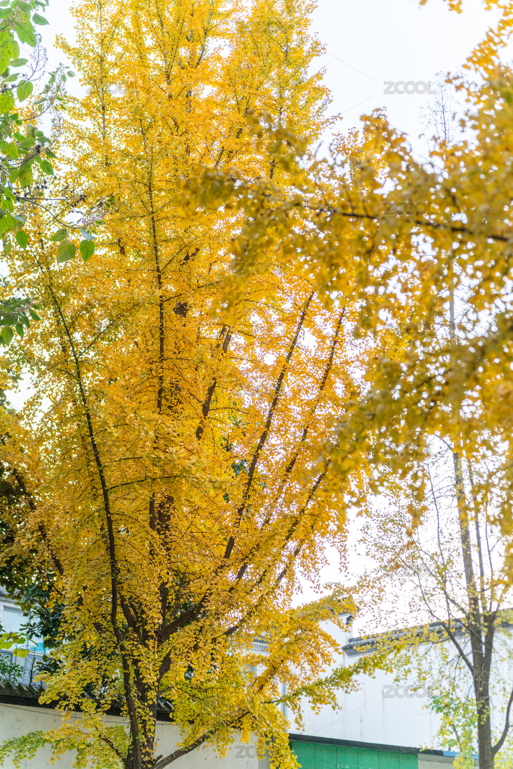 深秋晴朗天气下的黄色银杏