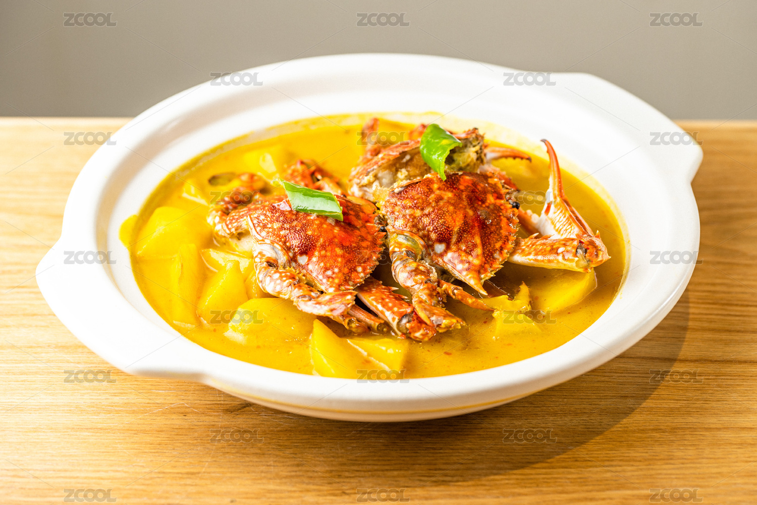木纹桌面上放着一盘咖喱蟹