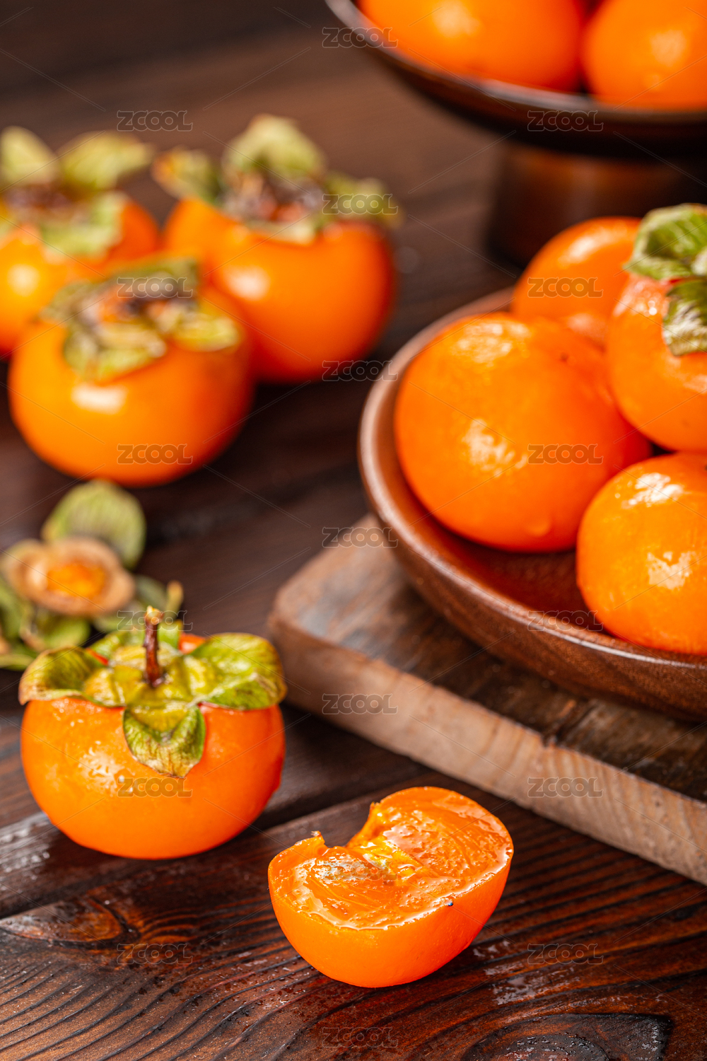 木纹桌面上摆放的柿子等静物,福建龙岩