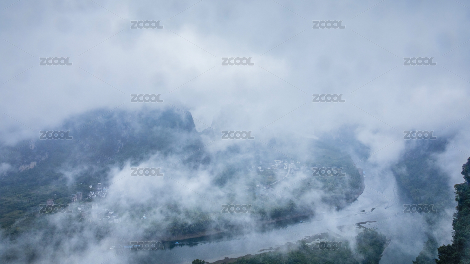 中国广西桂林漓江云雾缭绕的山水自然风光
