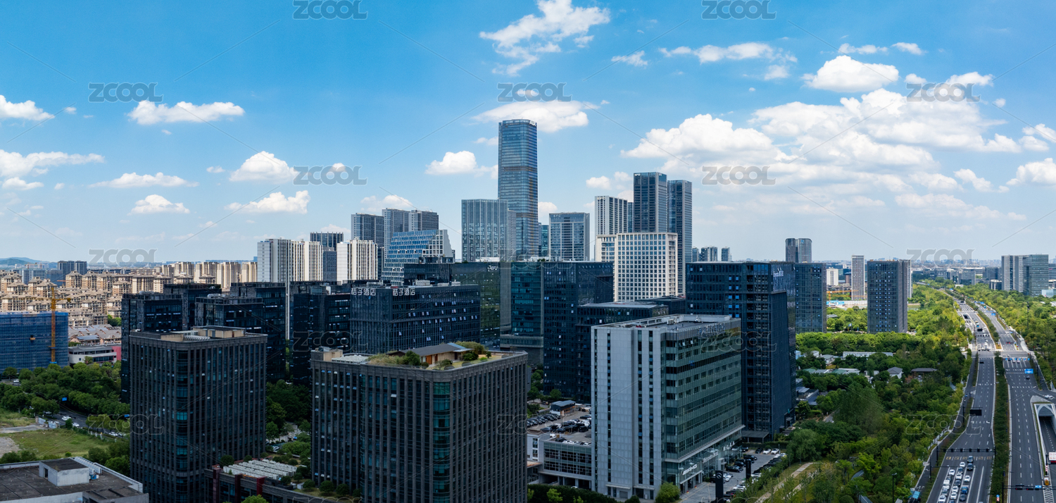 夏天高温晴朗天气航拍杭州未来科技城高楼大