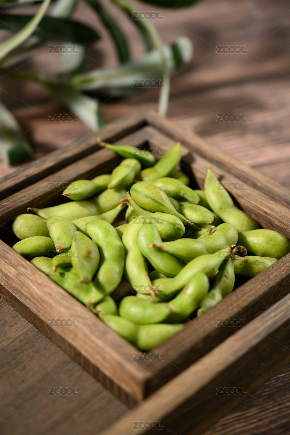 一簸箕毛豆角摆放在木桌面上特写深色调