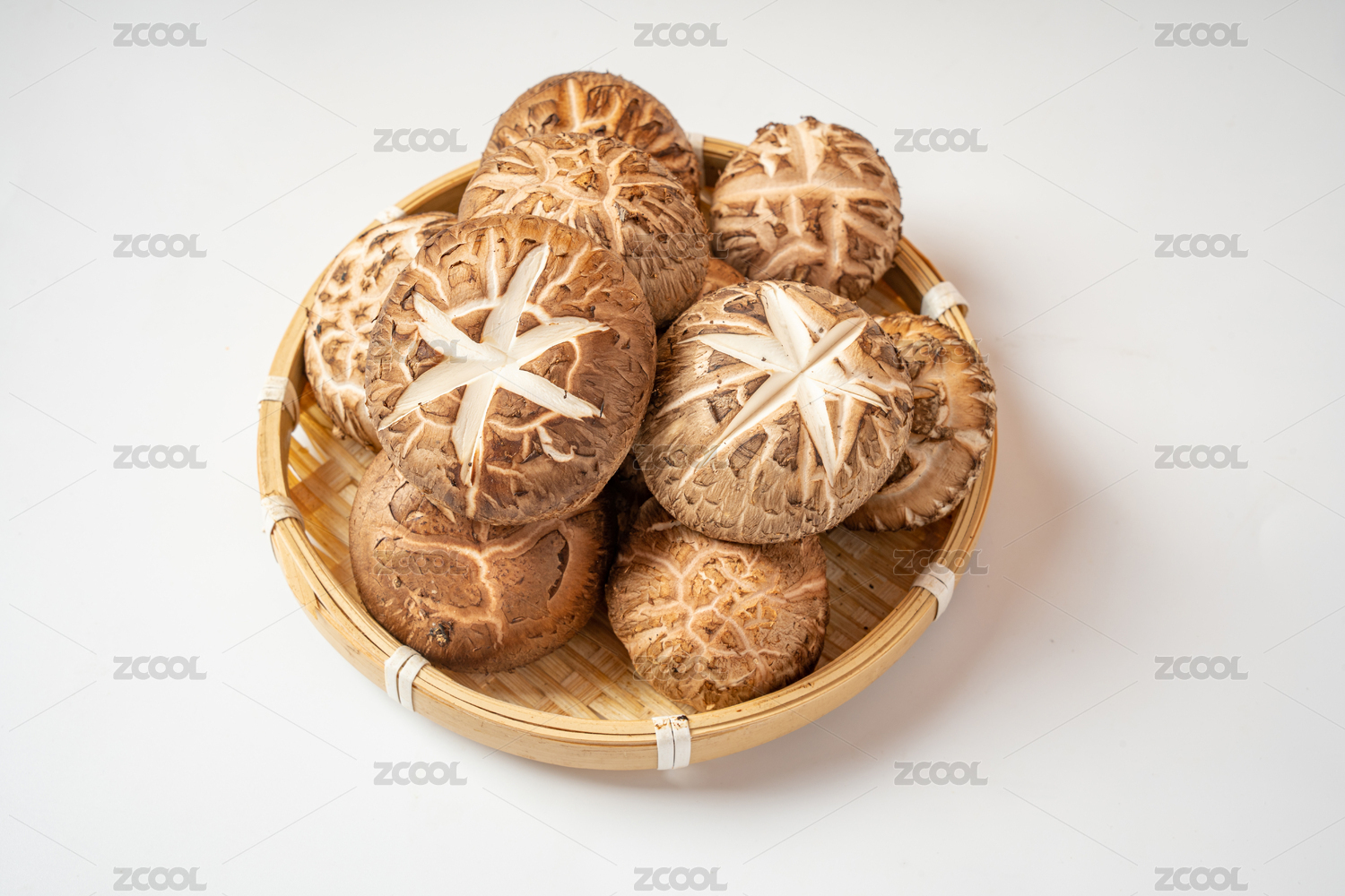 白背景正方形木质蒸笼里面装的新鲜松茸食材