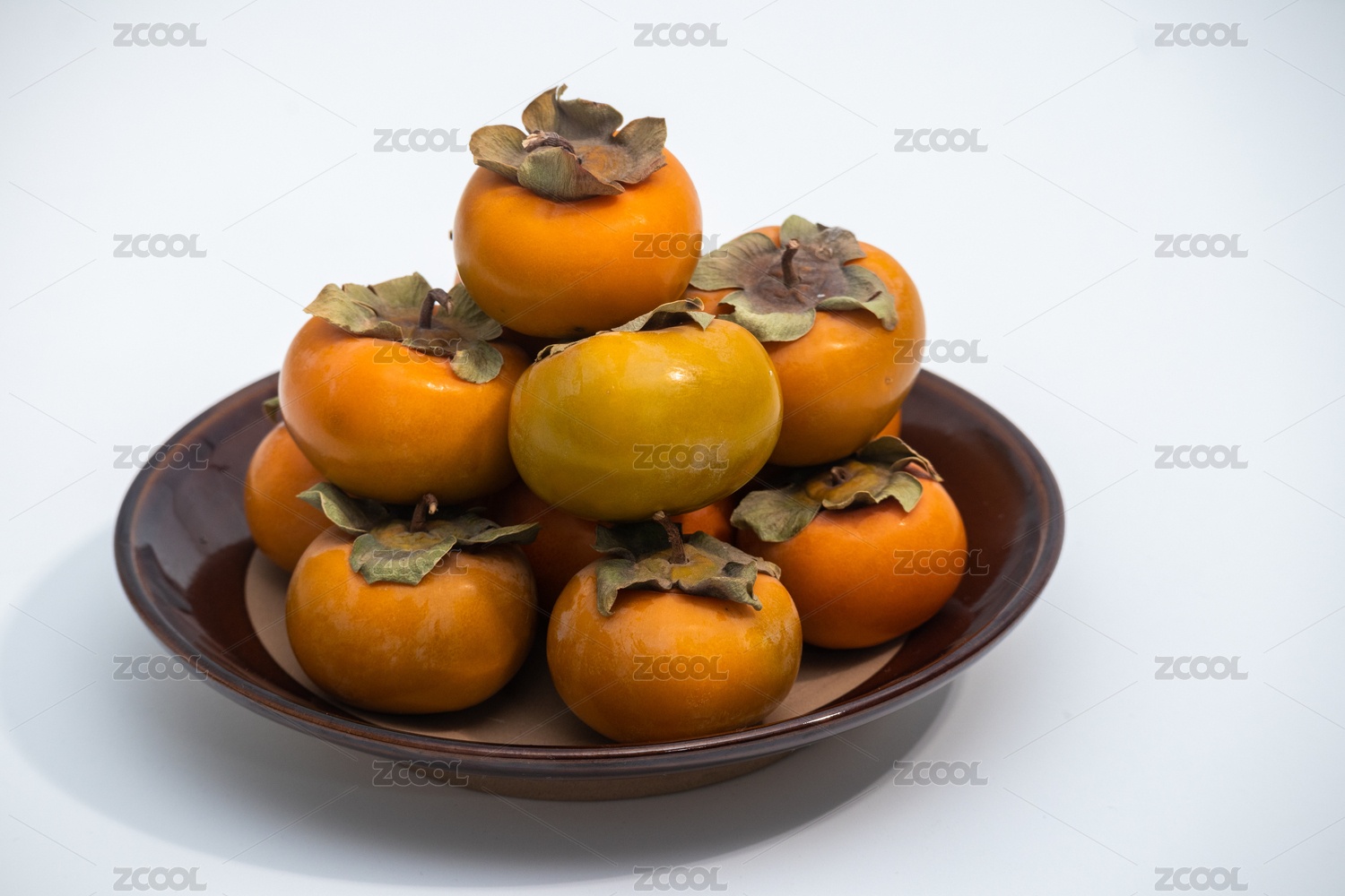 白色背景上摆着秋季新鲜采摘的柿子水果美食