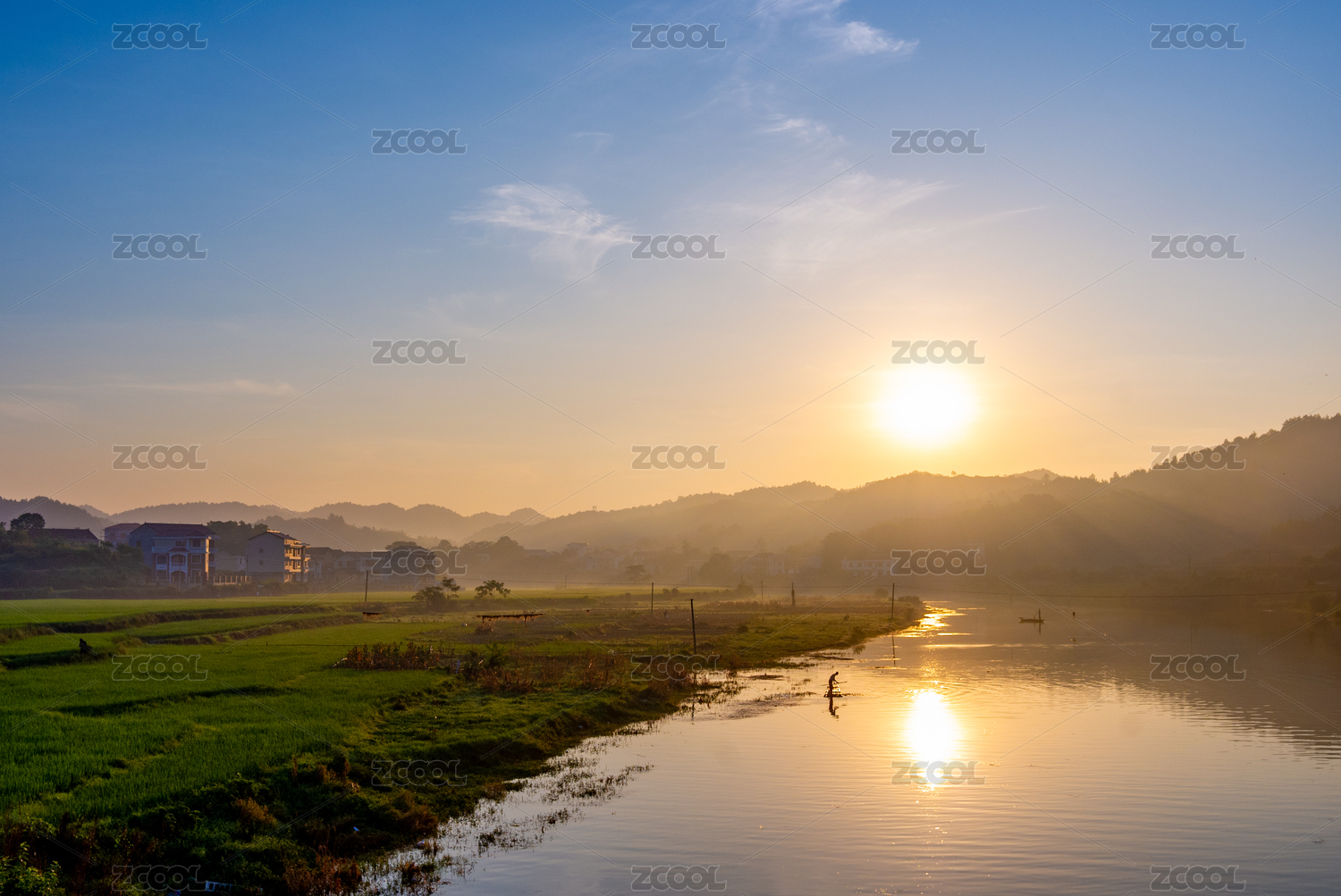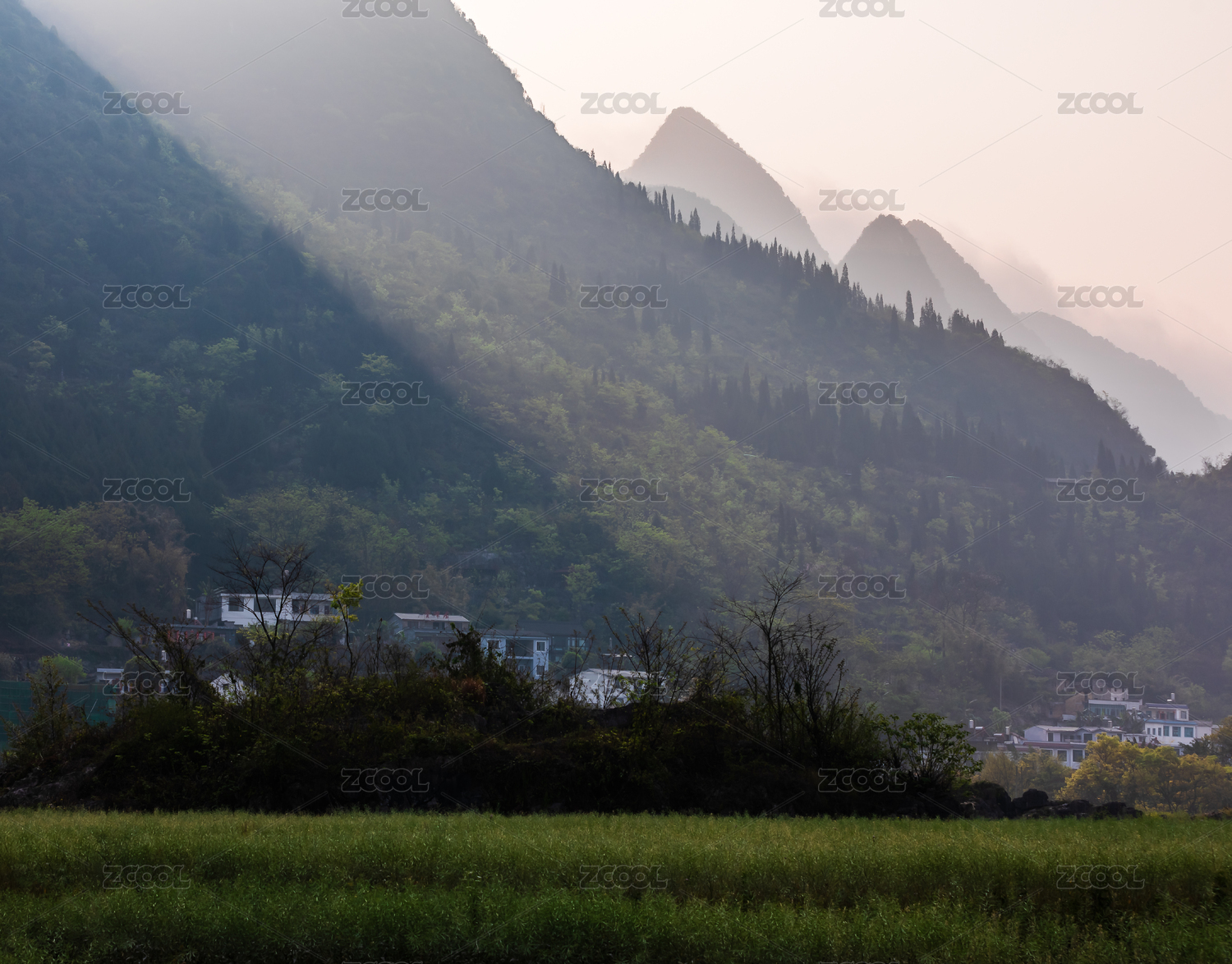 贵州兴义万峰林清晨的村庄、山峦与农田