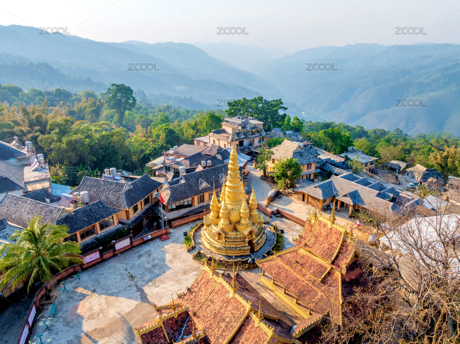 中国云南普洱澜沧县景迈山金塔佛寺航拍风光