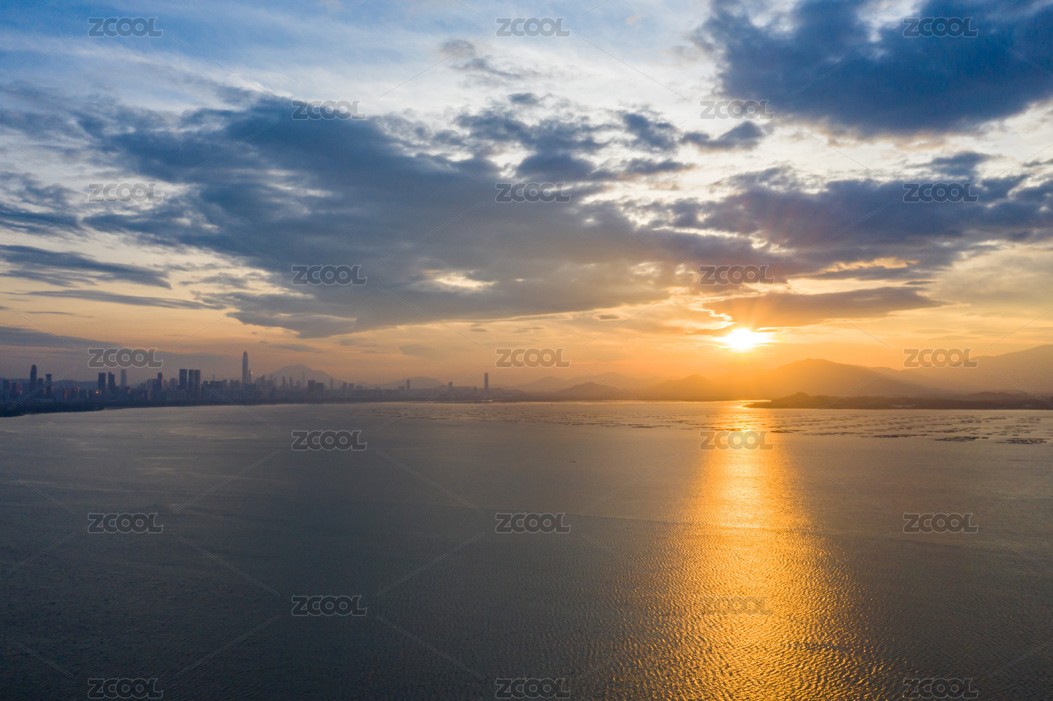 厦门海沧湾黄昏时分的城市天际线与宁静水面
