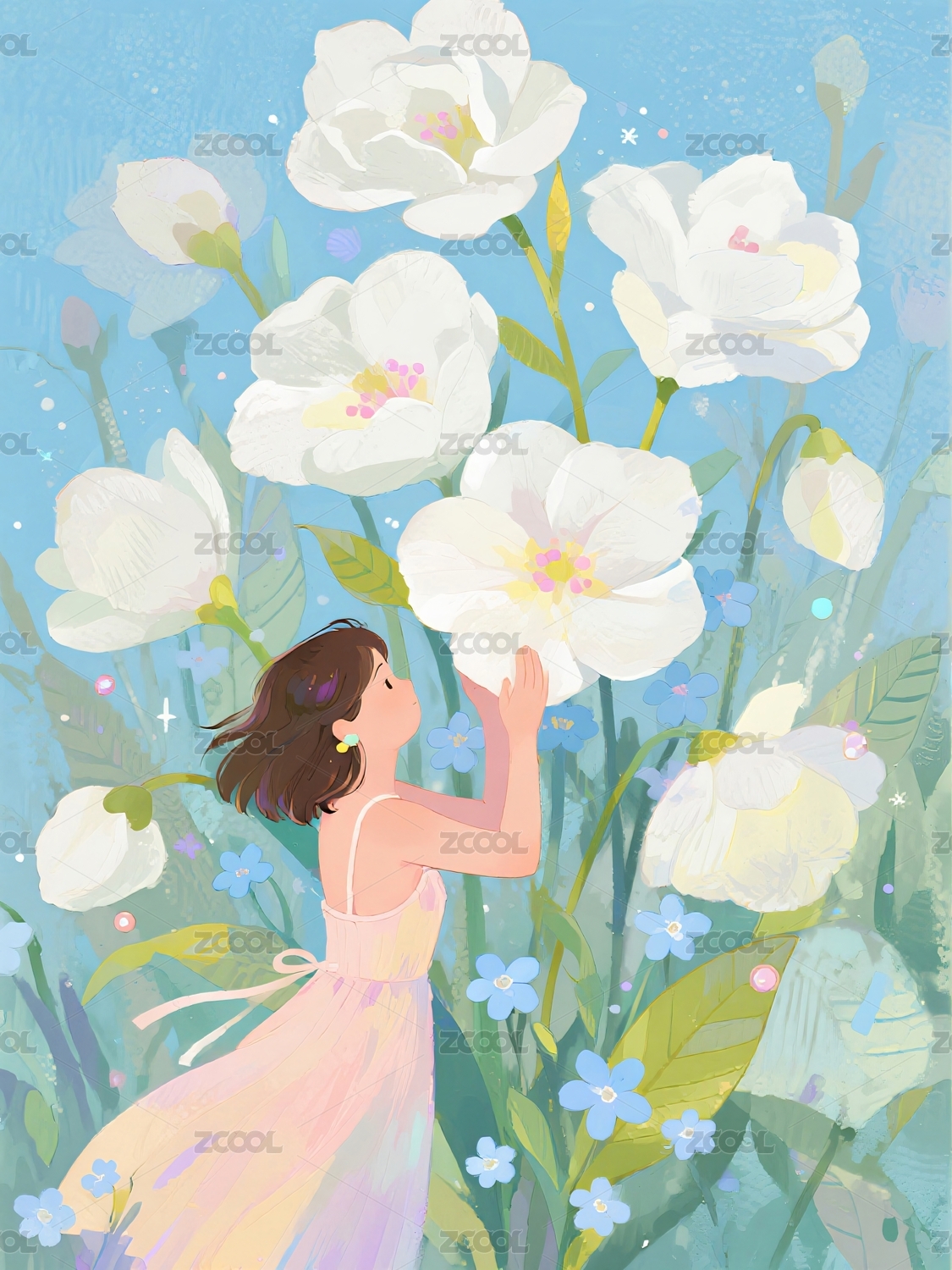 一个穿着黄色斑点裙子的女孩拿着一朵黄色的花飞舞在花丛中