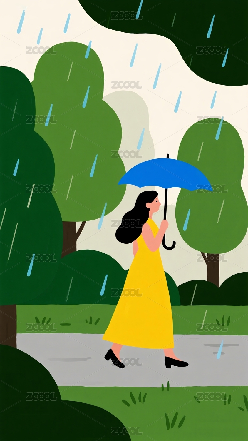 一个撑着伞的女孩带着自己的宠物狗在听音乐