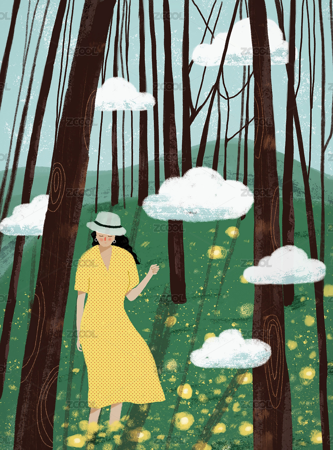 女孩森林草地奔跑蝴蝶清新治愈风景插画