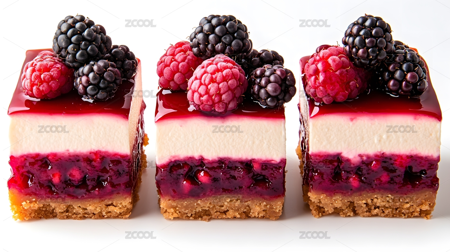 棕色木纹桌面上放着一块切开的蓝莓酱蛋糕