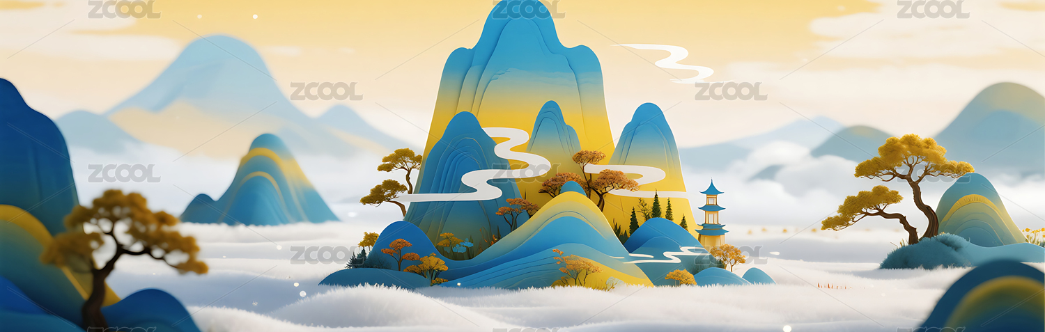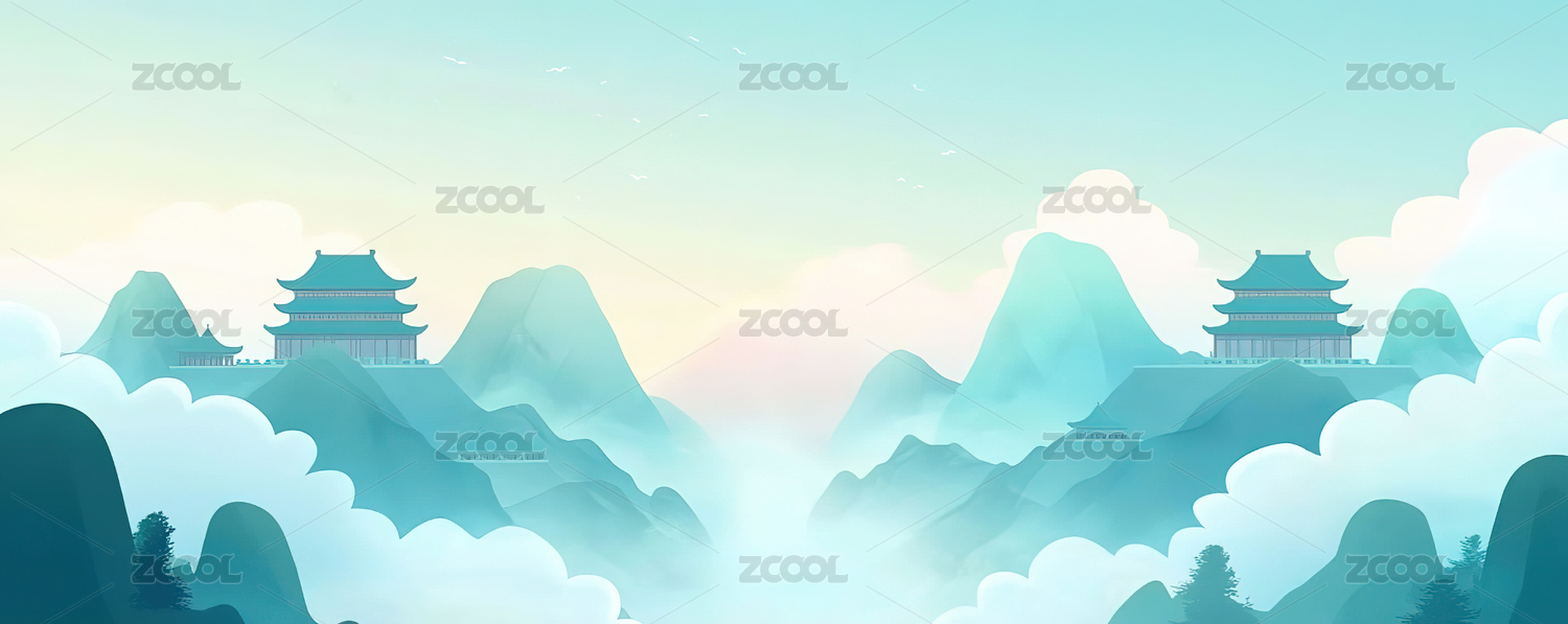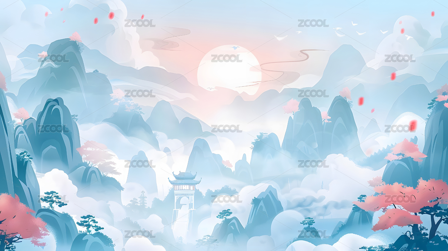 中国传统浅蓝色山水古风国风水墨画背景壁纸