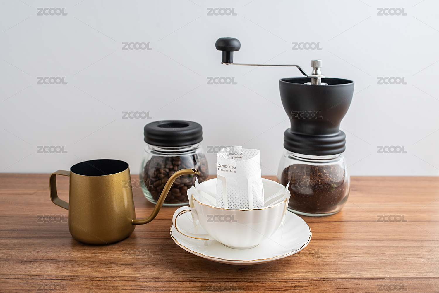 咖啡馆桌子上摆放的手冲咖啡工具和烘焙咖啡