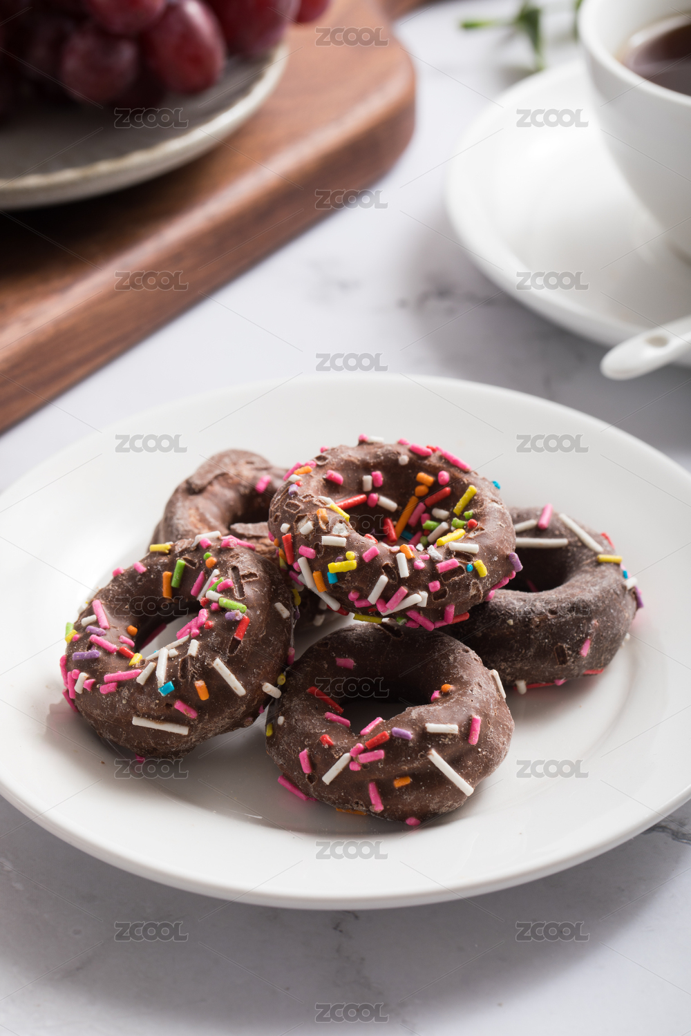 装在白色盘子上的下午茶点心巧克力甜甜圈