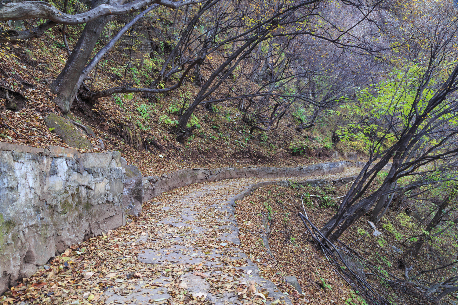 沈阳本溪老边沟,秋季多彩枫叶林间小路风光