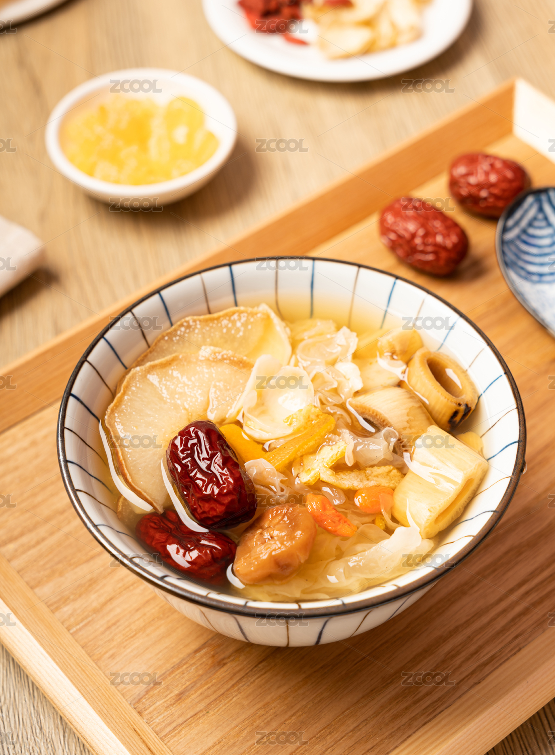 银耳汤银耳羹放在白色碗里放在木托盘上