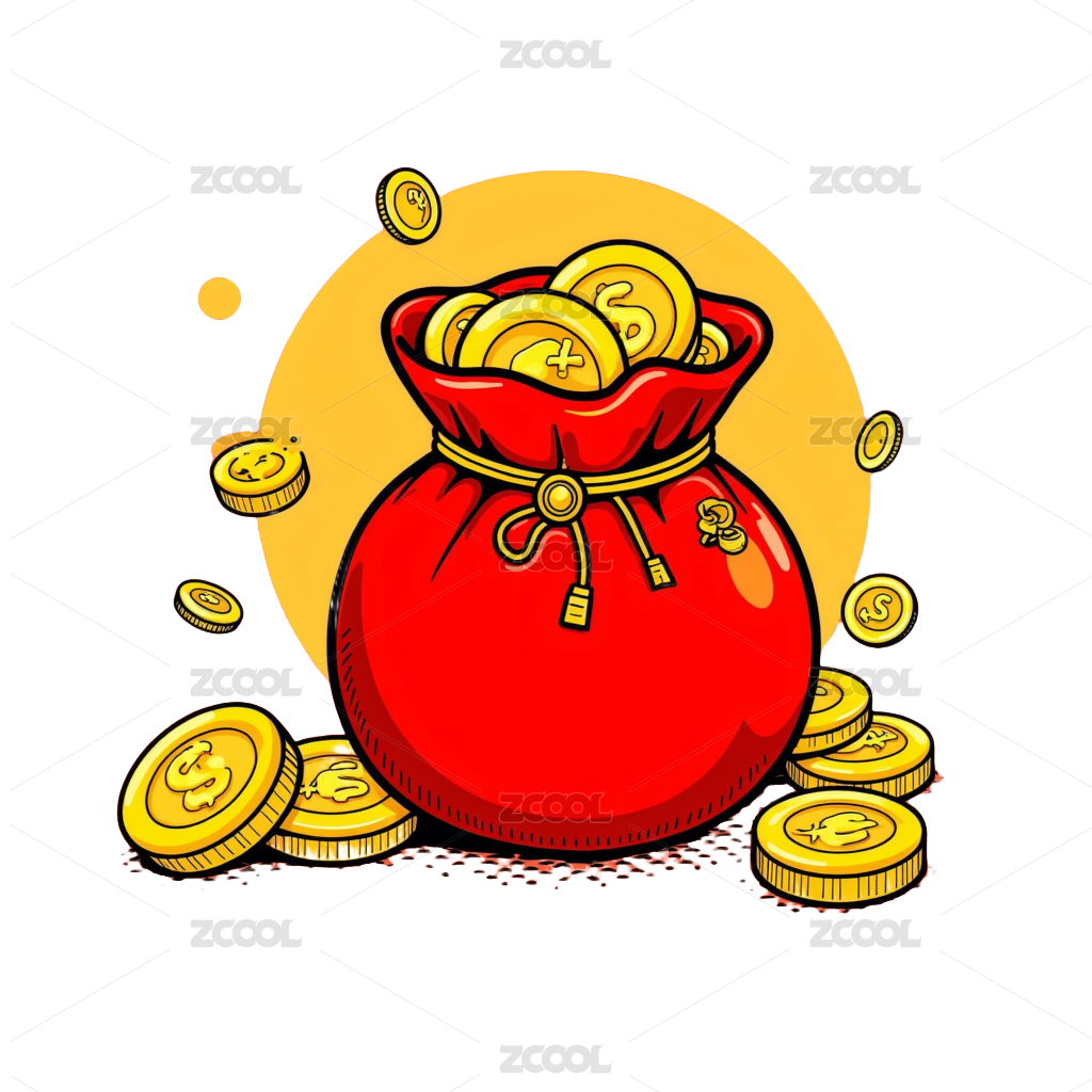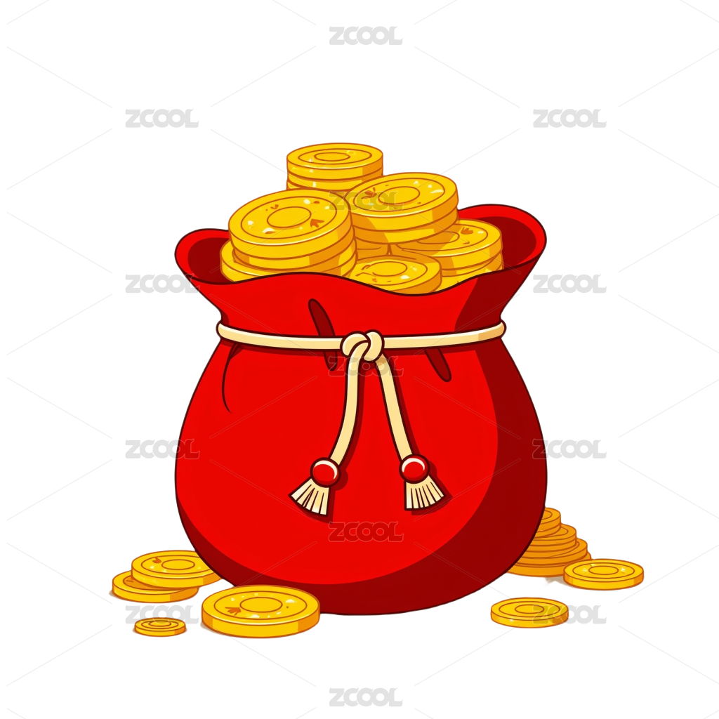 红金色装满元宝金币的钱袋扁平卡通描边元素