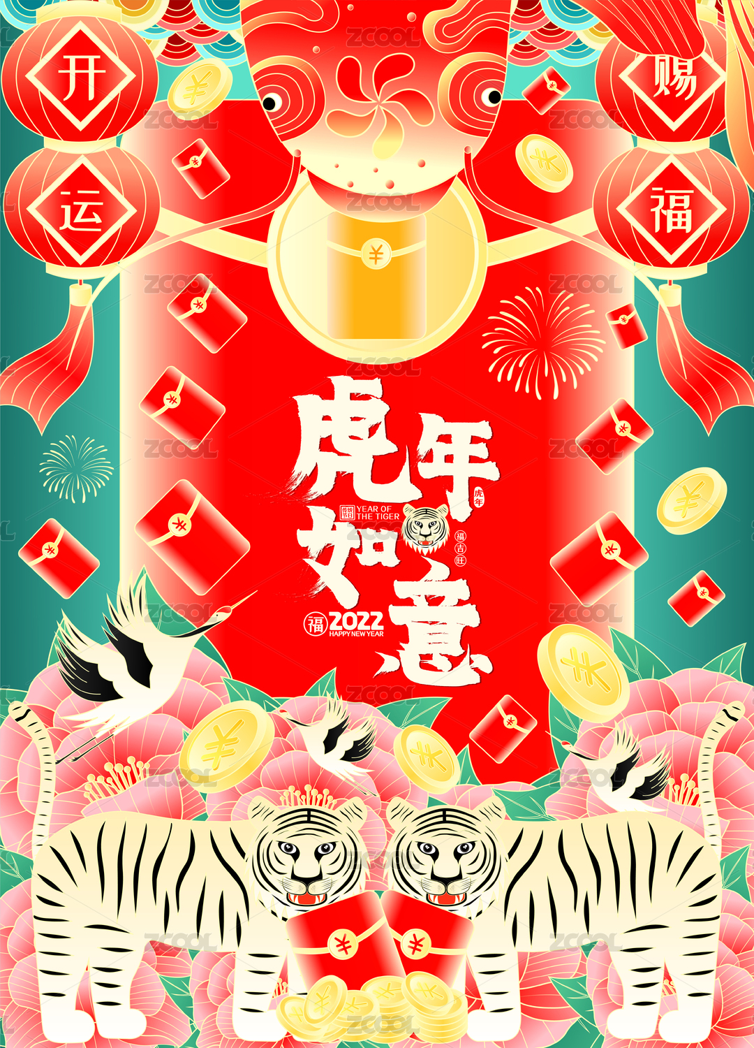 虎年如意国潮锦鲤好运红包春节老虎送福海报