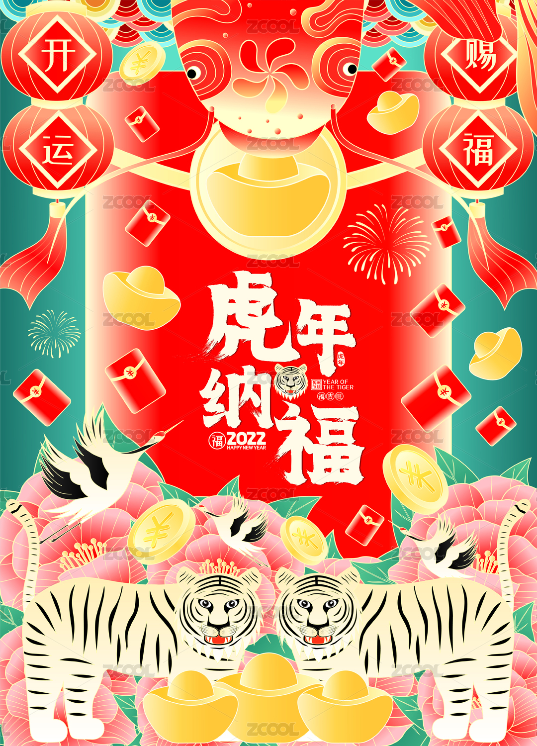 国潮春节迎新年凤凰老虎赐福锦鲤开运海报
