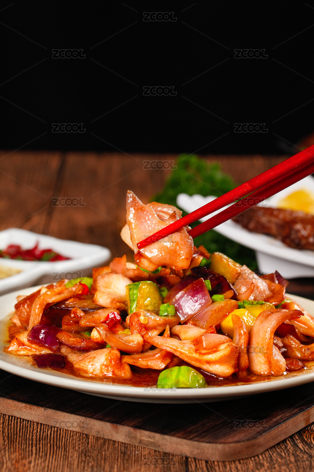 木底上放着一盘洋葱炒鸡冠和筷子上夹着鸡冠