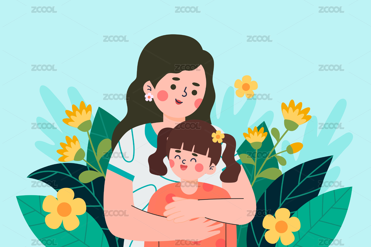 母亲节母子花丛拥抱插画感恩节家人鲜花海报